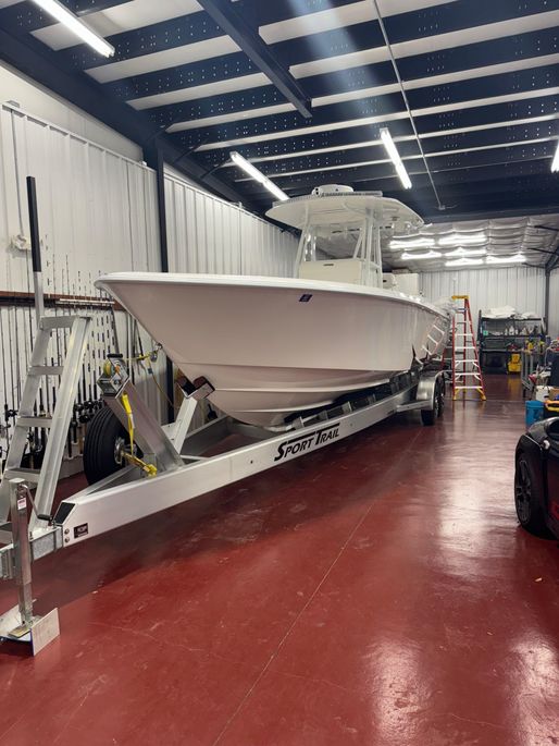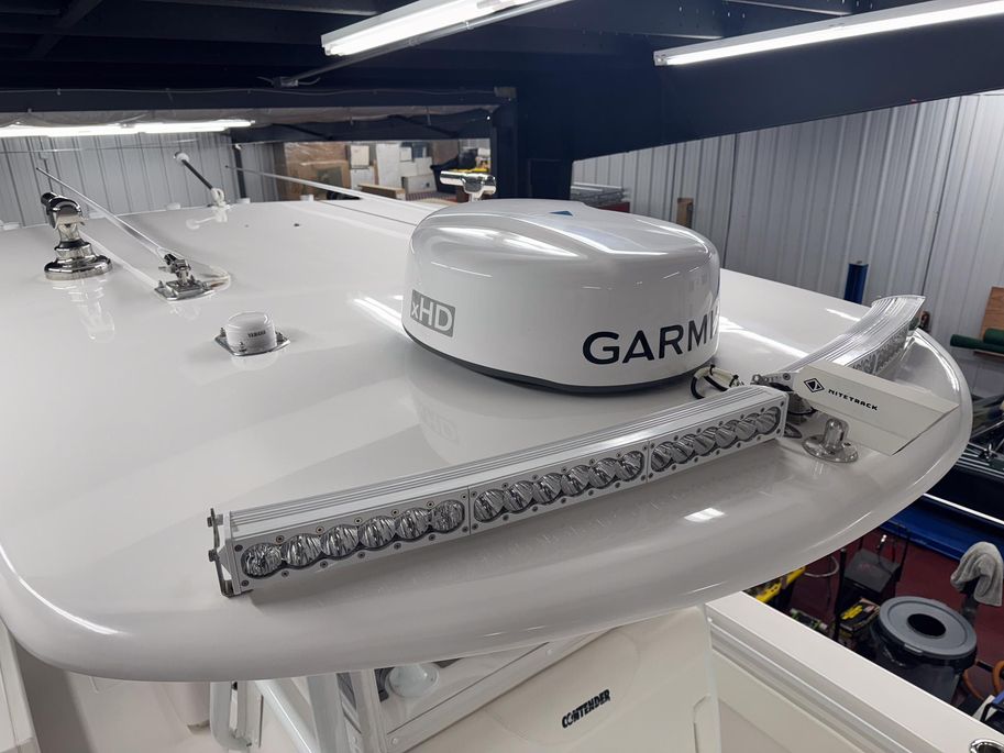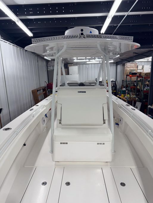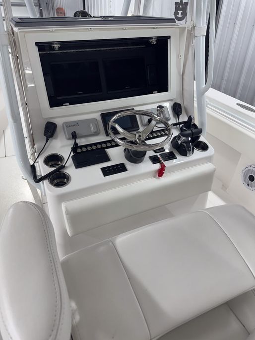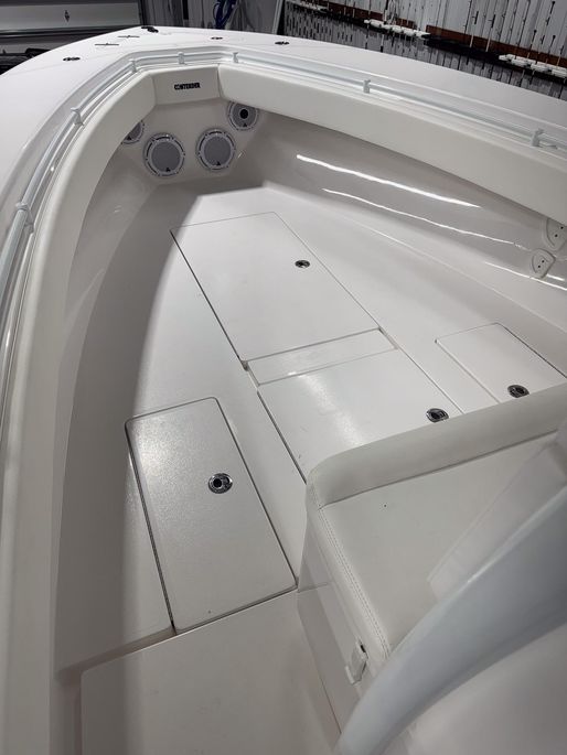 Hand-laid fiberglass hull with foam flotation and 32’ step design; custom sport console w/ LED dome light, sink/shower, porthole and locking electronics box; fiberglass T-top w/ three-sided polycarb enclosure, spreader lights, antenna mounts, outriggers and rod holders; self-bailing cockpit, integrated dive platform with full transom door; electric head, freshwater system, dual bilge pumps, salt-water washdown, Lenco trim tabs, multicolor under-gunnel and underwater lights; leaning post w/ slide-out cooler; livewell plumbing and fish box; pop-up cleats and stainless cup holders; premium Snow White Boltaflex upholstery.