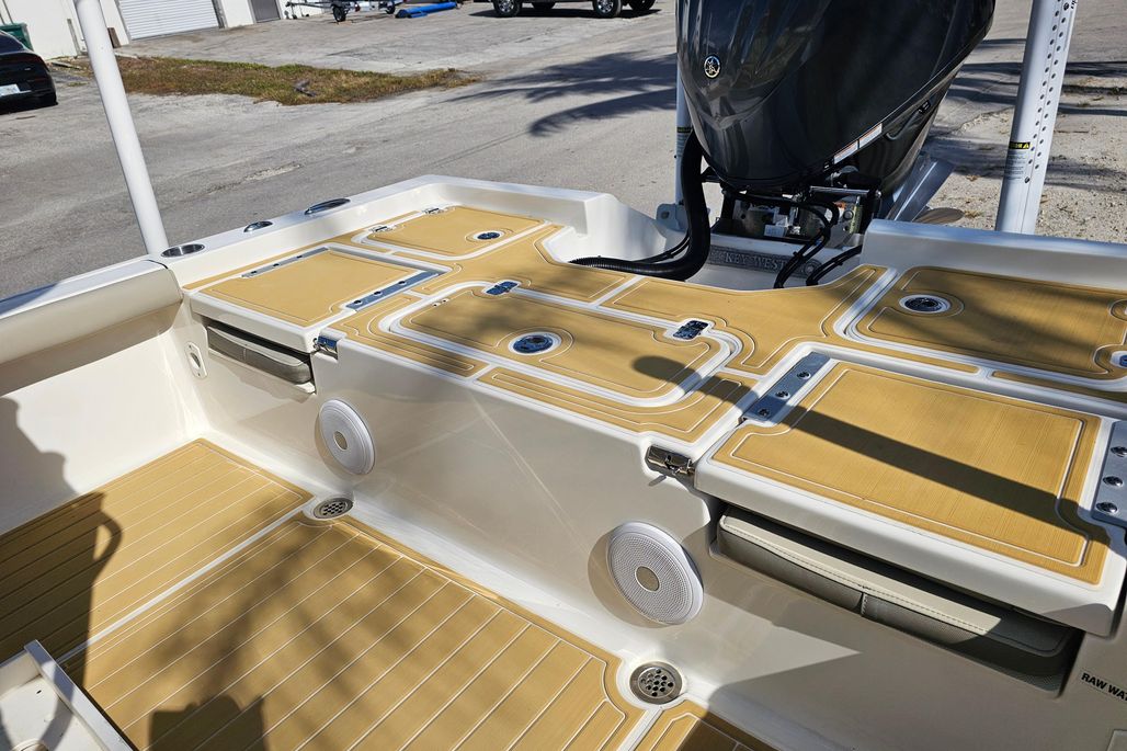 The interior provides lots of storage. There are two aft jump seats, Seadecking thruout, Forward of the console is the coffin box with fish storage with a macerator pump to drain it. Lockable rod storage, Gear and tackle storage, anchor locker. She even has an enclosed head compartment.