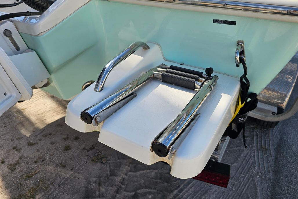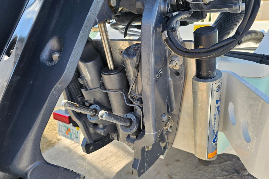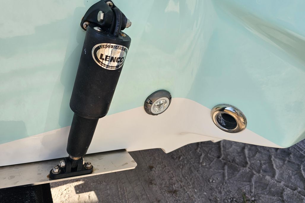 Includes factory power coated T-Top with built in speakers and LED lighting. The electronics box has a vhf radio. Electronics include a large screen Garmin GPS/ Fishfinder with a built in Fusion Bluetooth stereo, six speakers and amplifier. Lenco Trim Tabs, Yamaha Command link Gauge. There are twin 10 Foot Power Poles on Brackets, Atlas Hydraulic Jackplate, Minnkota 36 volt Trolling motor with battery charger. Two cranking batteries.