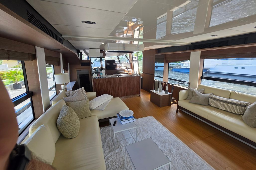 The 2022 Prestige X70 is a luxury motor yacht designed with superyacht features, including a full-beam main deck for increased interior space, a large beach-style aft cockpit, and a massive flybridge for relaxation and entertaining. Powered by Volvo Penta IPS 1350 engines, it offers easy maneuverability with joystick control. The interior features a private owner's suite and a salon with drop-down windows, all designed to provide an unparalleled experience of life at sea.
