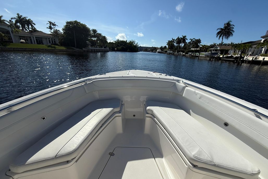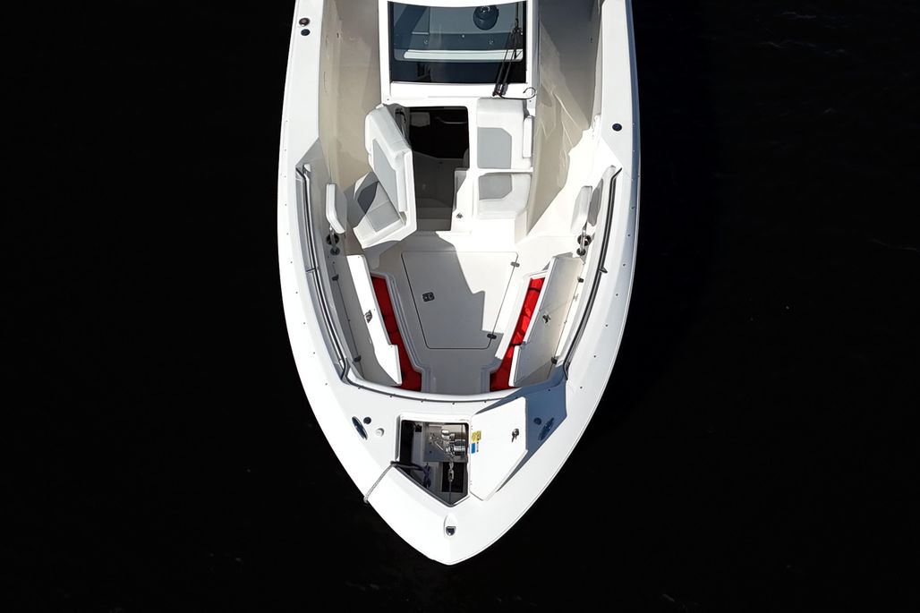 Finished in Fresh White hull color with a Navy boot stripe and Carbon helm, this boat presents a clean, timeless look. The White/Gray upholstery and Black canvas create a modern contrast throughout.