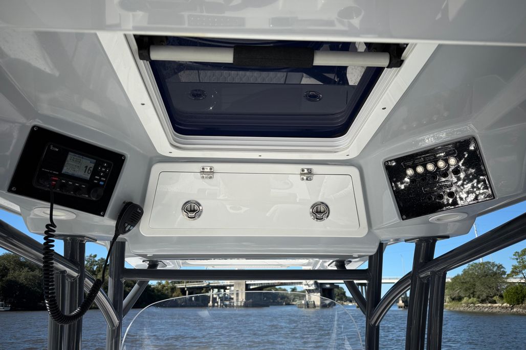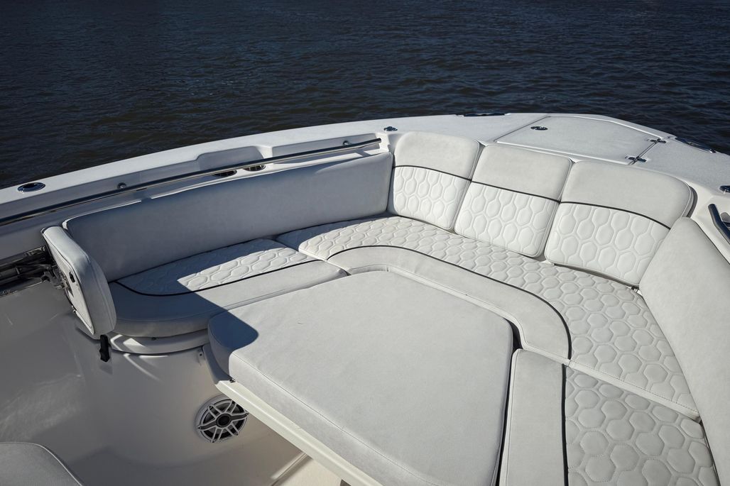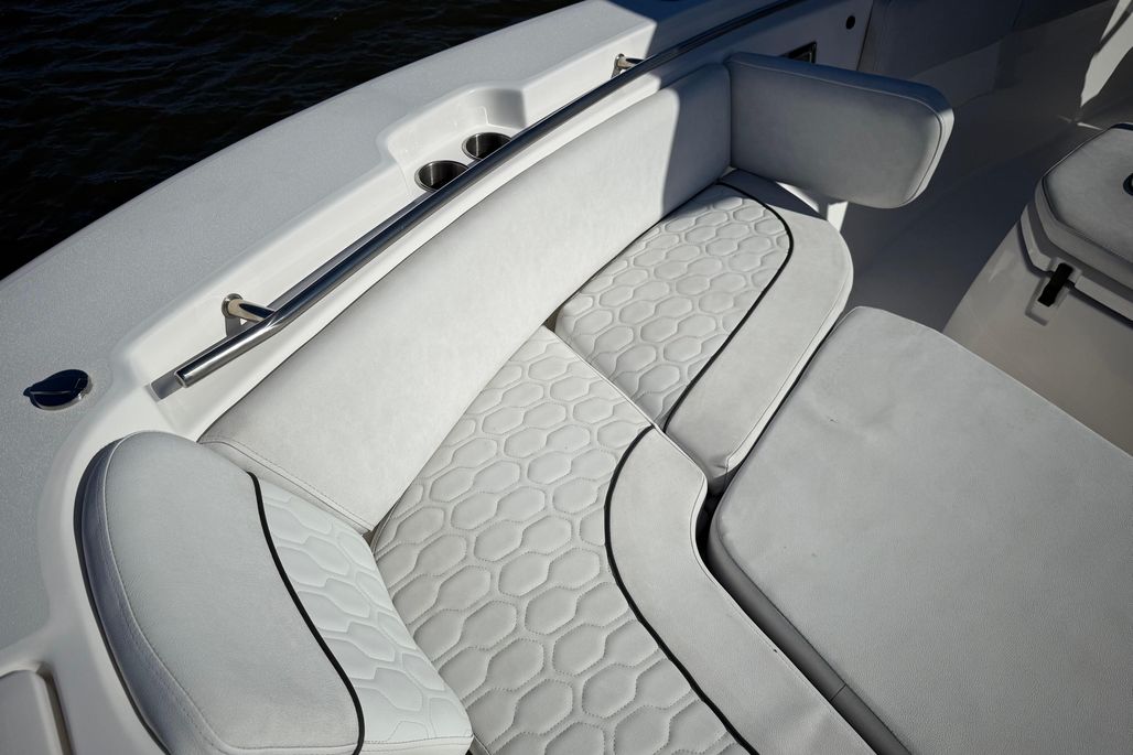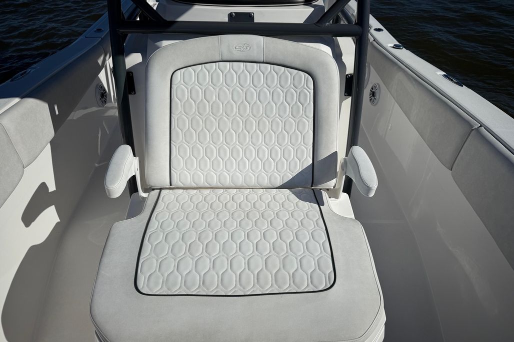 Standard Features and Factory Options include Silver Shark Full Hull Color, Ultima Hard Top, Silver Shark Underside Color, Jetty Grey Powder Coat Package, Upgraded Platinum Cushion Package, Bow Backrests, Bow Table, Bow Filler with Cushion, Leaning Post with Bolsters, Console Chaise Lounge, Flip Up Transom Seats, Electric Head, Overboard Waste Discharge, Lenco Trim Tabs, Tackle Center, RTIC Cooler, (2) Pressurized Livewells, (2) Macerated Fishboxes, Windlass Anchor System, LED Light Bar, Freshwater Washdown, Raw Water Washdown, Side Door, Swim Platform, Swim Ladder, and Bow Shade Kit.