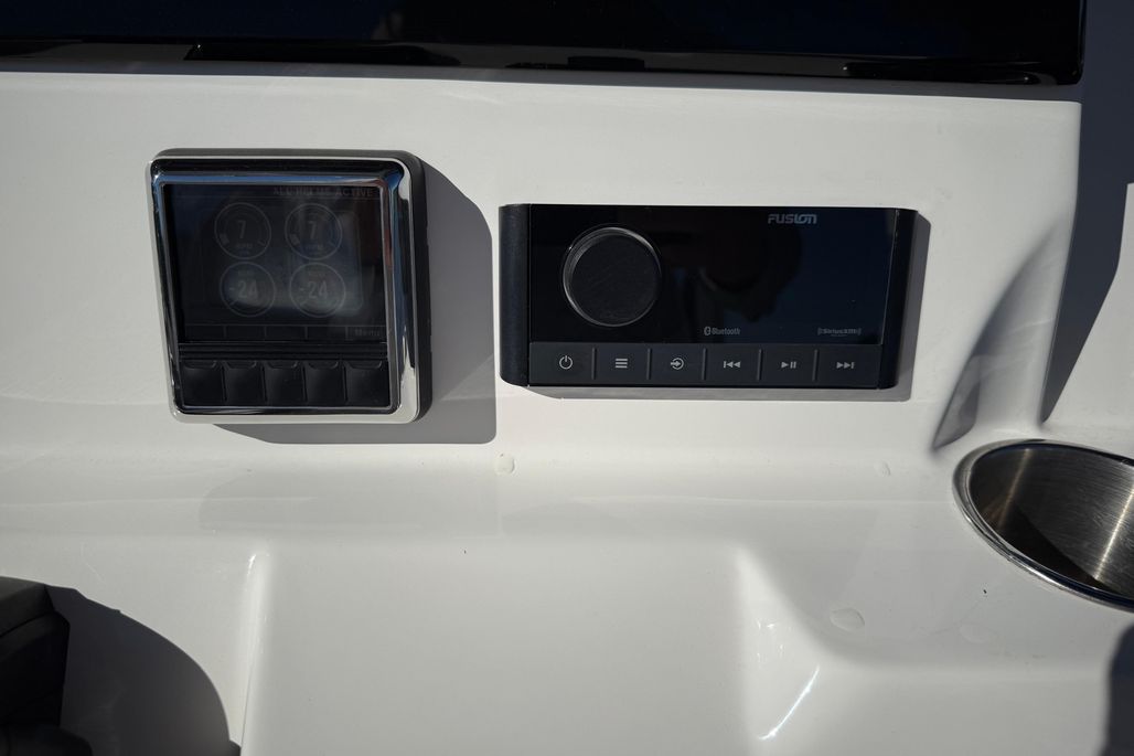 Electronics include (2) Garmin 8612XSV GPS/Chartplotter/Fishfinders, Garmin Radar, Icom M510 VHF Radio, Yamaha CL5 Multifunction Engine Gauges, Fusion Bluetooth Stereo System, (2) JL Audio Amps, (6) JL Audio Speakers, (2) JL Audio Subwoofers, and Wireless Cell Phone Charger.