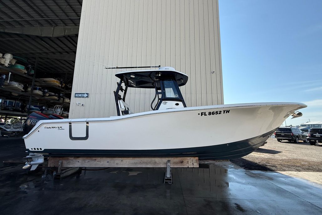 Hull & Construction • Tidewater solid-built hull with deep-entry bow for a comfortable offshore ride • Clean gelcoat, stainless hardware, and well-maintained cosmetic condition • Self-bailing cockpit and robust construction for heavy use