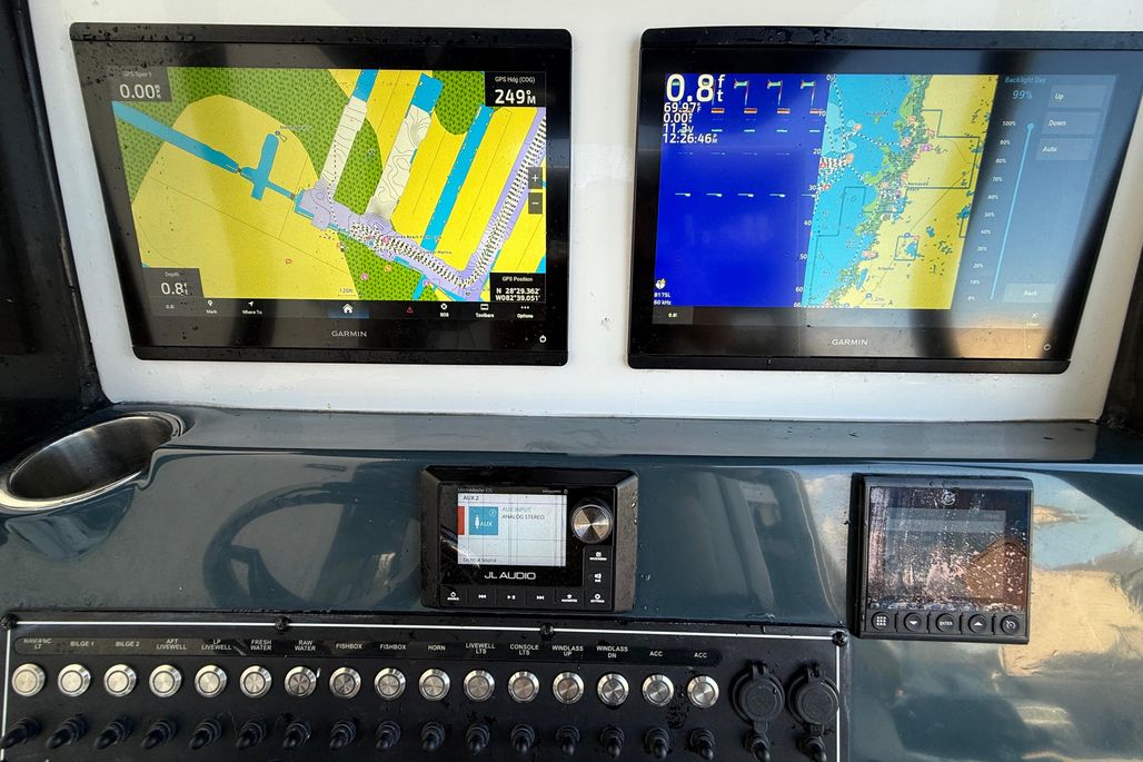 Electronics & Navigation • Garmin 8616 / 8616xsv touchscreen MFD (large, bright chartplotter/fishfinder) • Garmin 24xHD radar — high-definition target separation for safe runs in low visibility • Garmin trolling motor with GPS anchor/spot-lock capability for precise positioning when fishing • Airmar B175M 1kW CHIRP thru-hull transducer for excellent target clarity at speed • NMEA2000 integration and Mercury data display at the helm