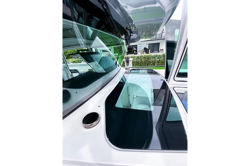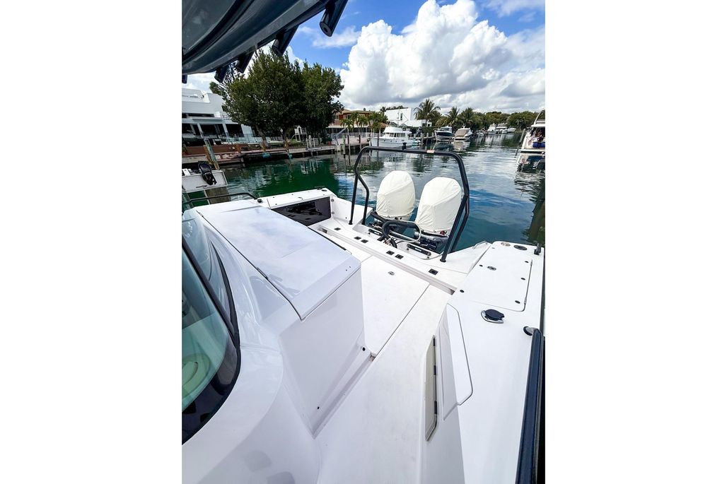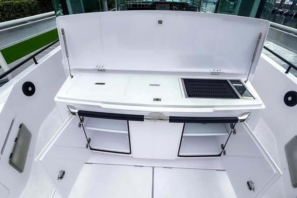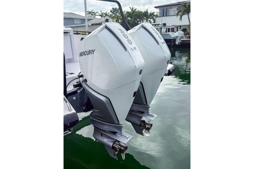 Finished in a striking Platinum Grey hull and featuring the desirable Brabus trim level, this vessel is equipped with heavy-duty air conditioning (30,000 BTU) serving both the front cabin and pilothouse, an upgraded battery system with 3 × 200-amp batteries, an adjustable table in the main cabin with filler cushion, and the sought-after wet bar aft configuration. Professionally maintained, showing in pristine condition, and powered by twin Mercury V8 300 HP outboards with only 140 hours, this boat is fully turnkey with complete service records available.