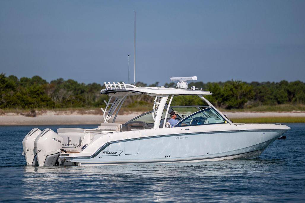 Cutting-edge features, great capacity and easy adaptability are hallmarks of the dual-console 320 Vantage®, winner of the National Marine Manufacturers Association's Innovation Award for it's convertible seating. Rock-solid control meets the ultimate in versatility and comfort with the many accessories and options the 320 provides. Serious fishing, joyful entertaining, day-long watersports or cruising and even a place to sneak in a nap or an overnight stay, the 320 is ready for your day. When the softest, safest ride meets the best equipped dual-console around, new possibilities become eminently possible. With Whaler, you can be confident to the core.