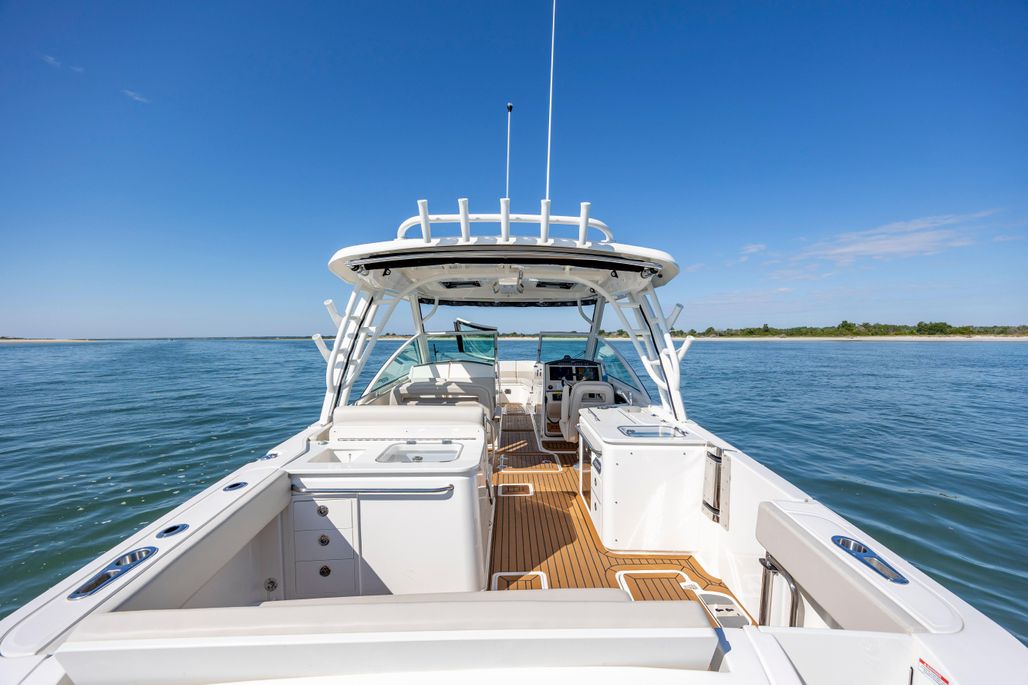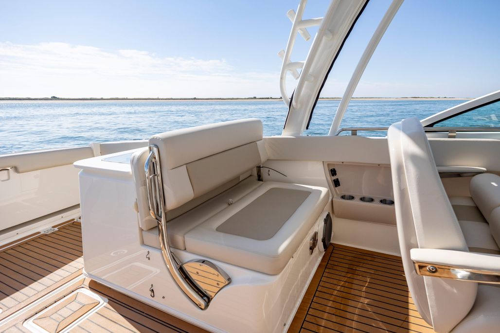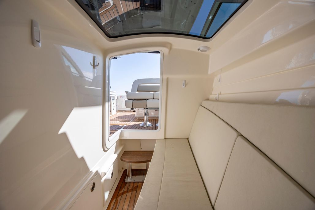 - A cockpit utility center includes a sink, 18-gallon cooler and prep surface, plus optional grill and fridge.
