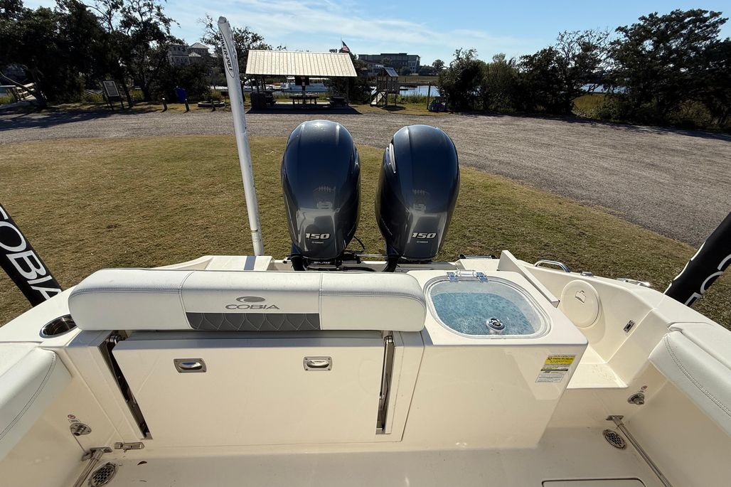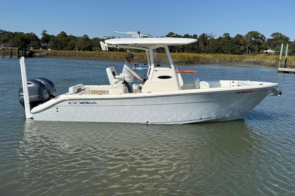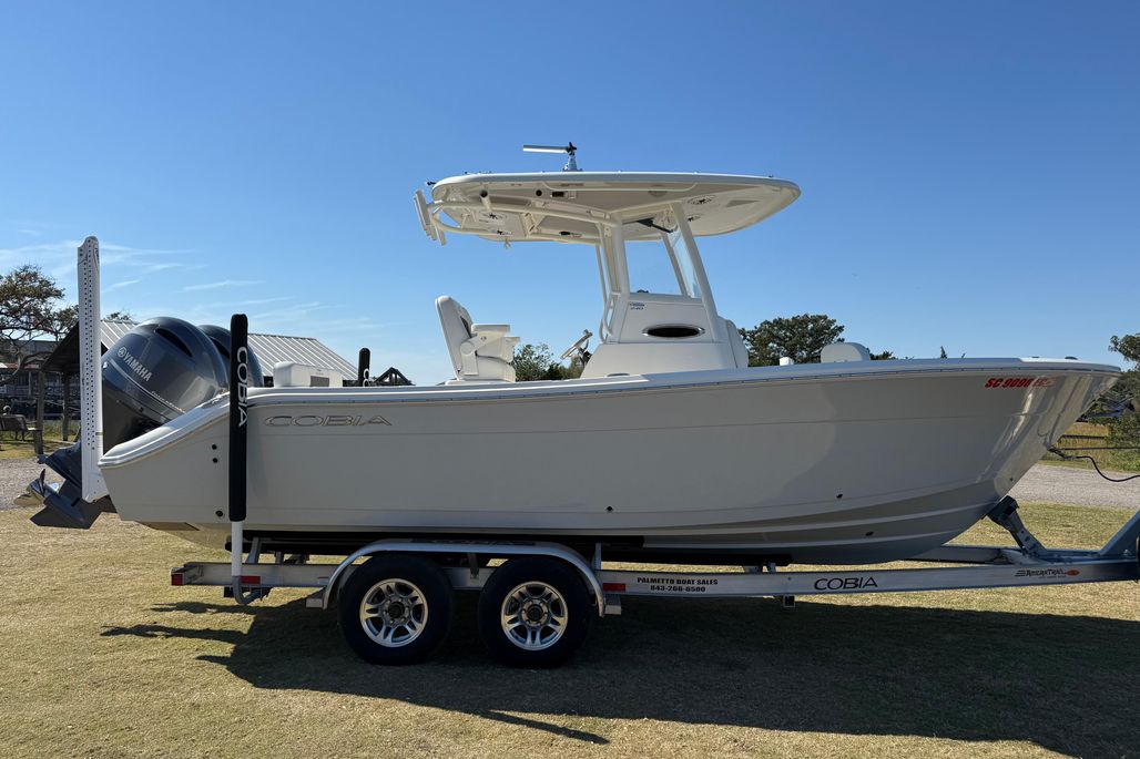 2023 Cobia 240CC powered by twin Yamaha F150XCAs and includes an Ameratrail Tandem Axle Custom Welded Trailer.