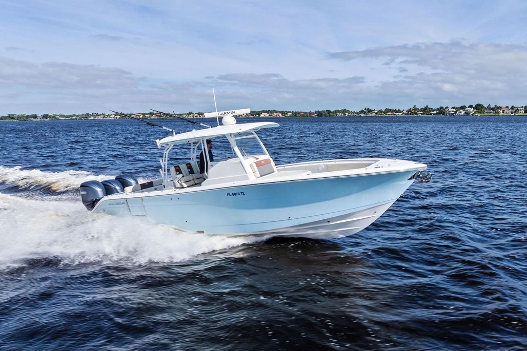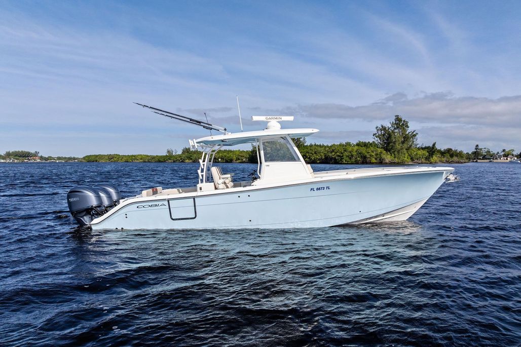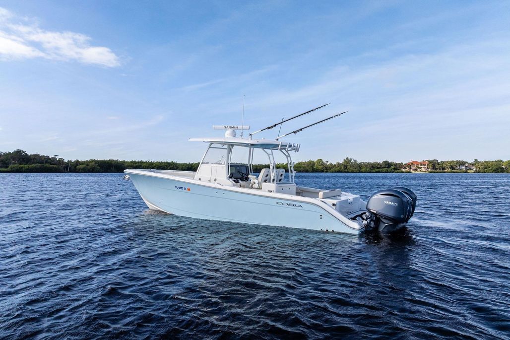 The Cobia 350 CC is a high-performance, luxury-oriented center console boat that blends serious fishing capability with refined comfort. At roughly 34.33 feet in length (with a beam of 11.17 ft), it provides substantial real estate for both angling and leisure. The hull is constructed using vacuum-infused fiberglass and features a double-stepped design, which helps optimize speed, efficiency, and a smooth ride with the SeaKeeper SK2.