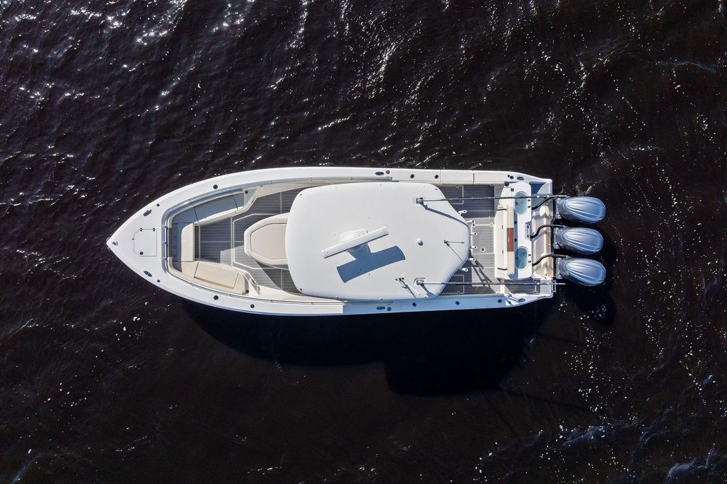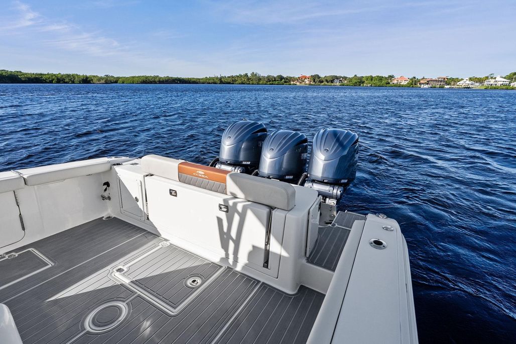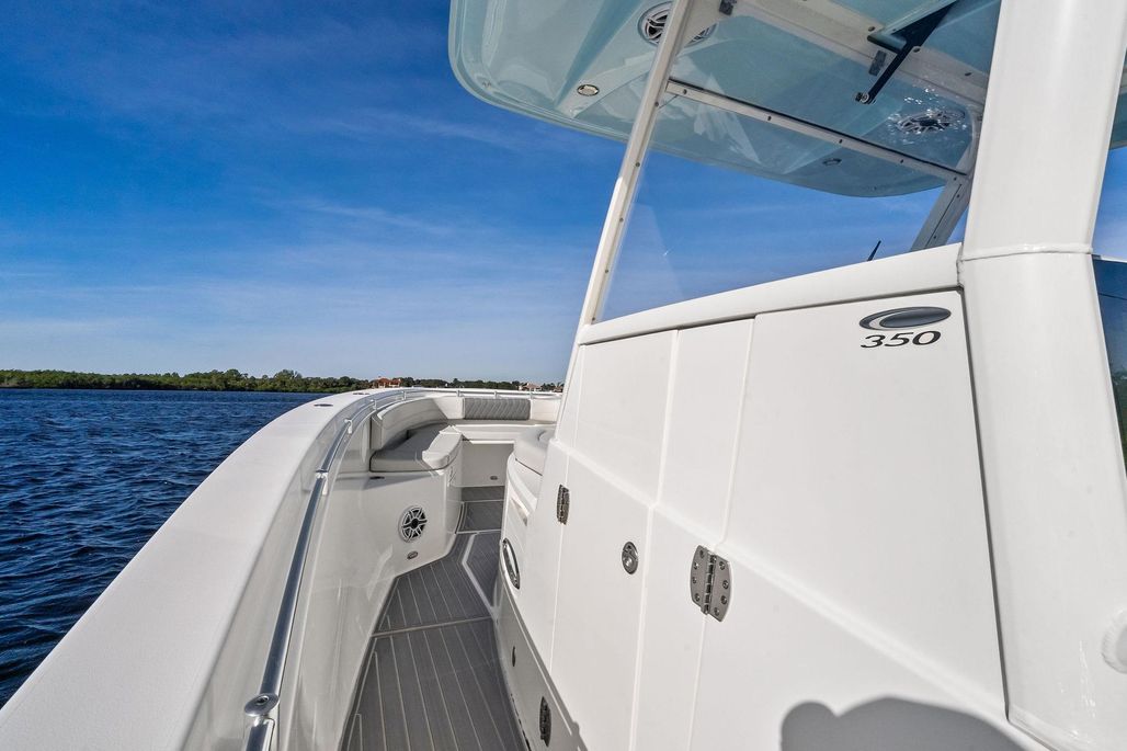 Finally, the ride and weight: according to spec, the dry weight of the 350 CC is about 10,560 lb, and the transom deadrise is 21.6°, which suggests a good balance between seaworthiness and performance.