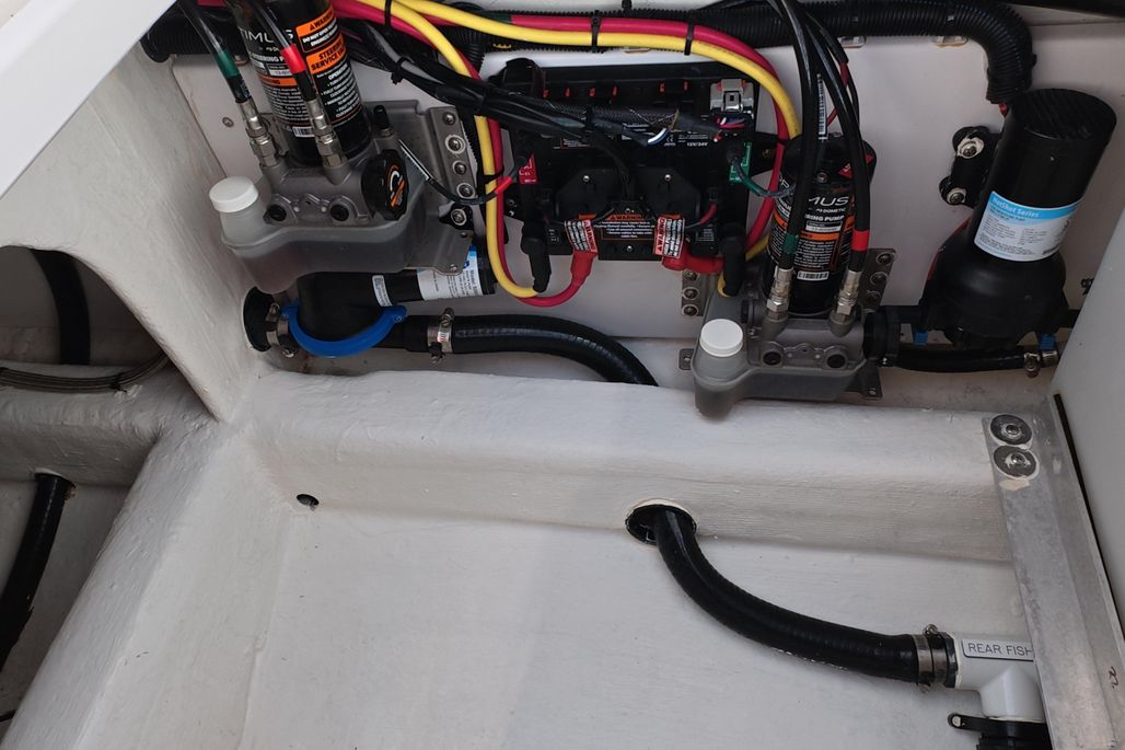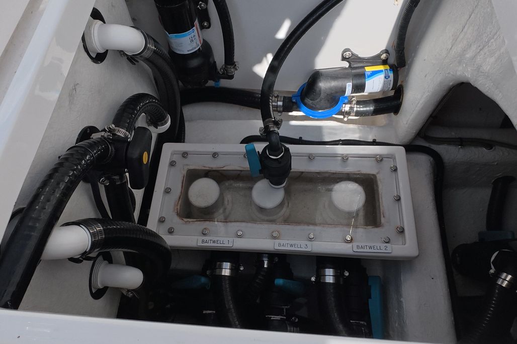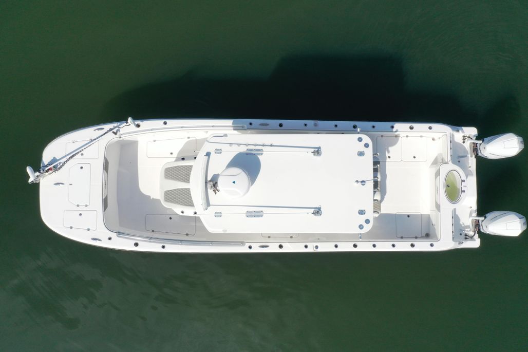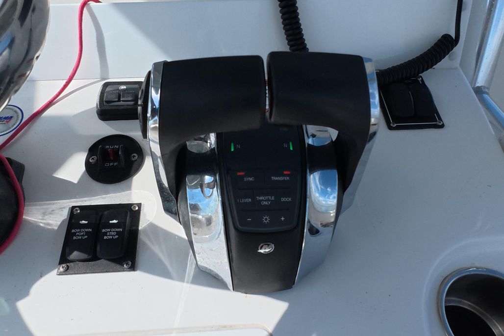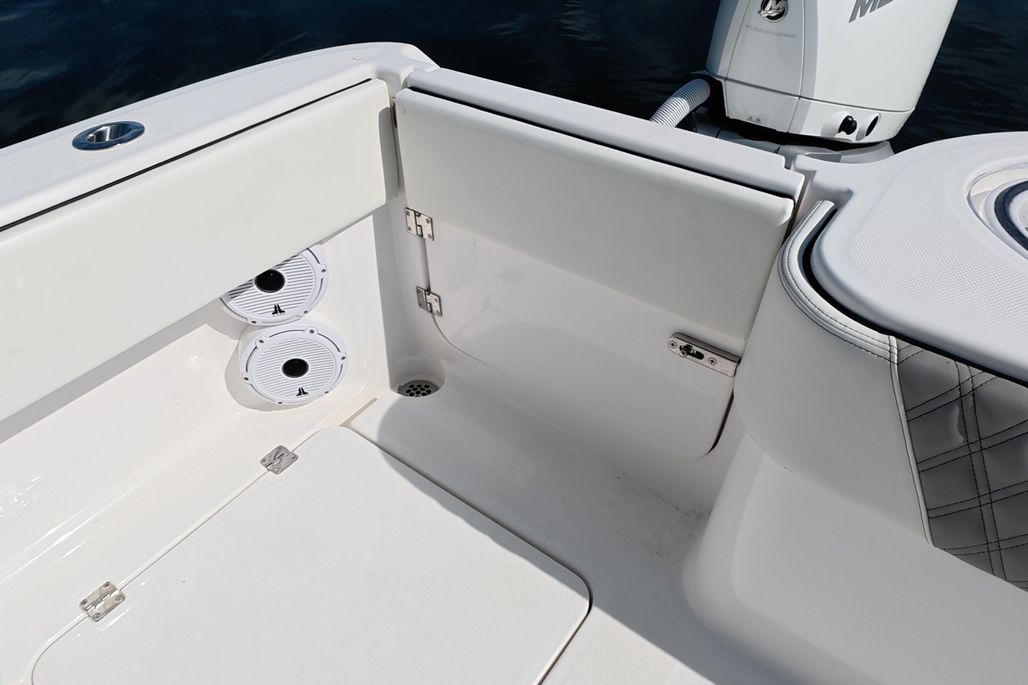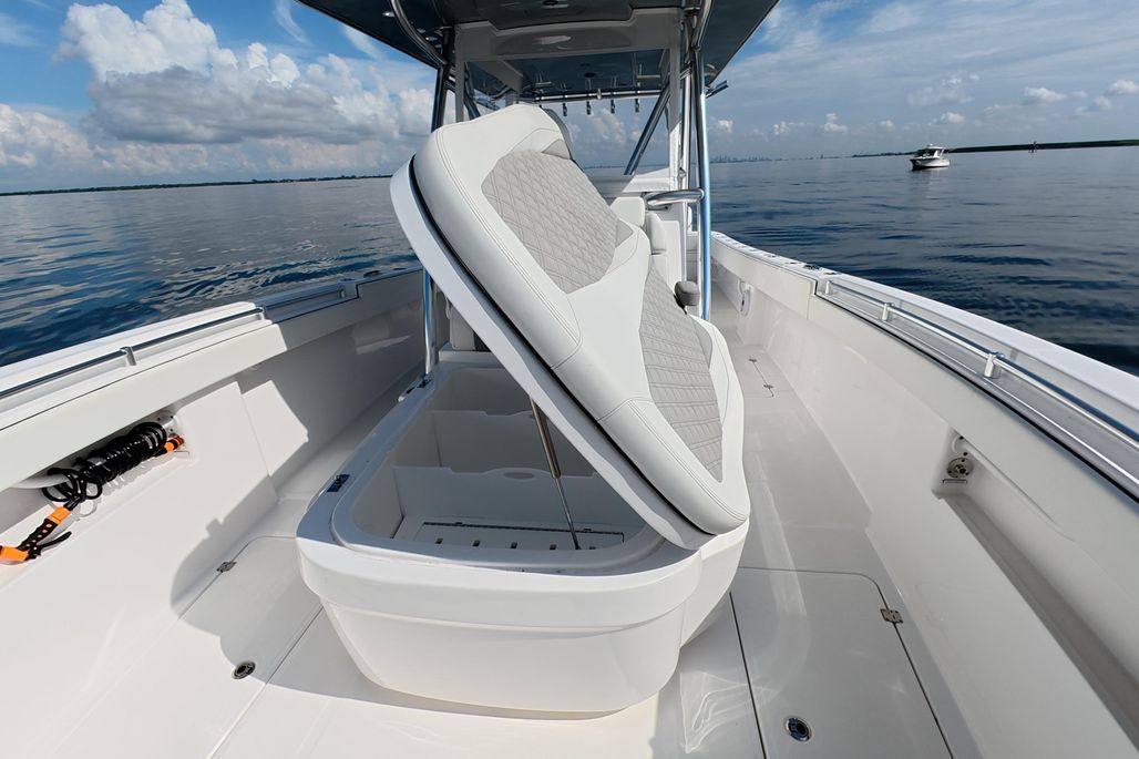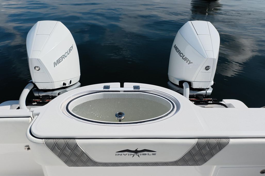 Powered by twin Mercury 300 V8s (with low hours), she cruises effortlessly through chop while maintaining fuel efficiency and comfort. The patented hybrid semi-asymmetrical hull design ensures a smooth, dry ride with incredible maneuverability and speed – even in offshore condition.