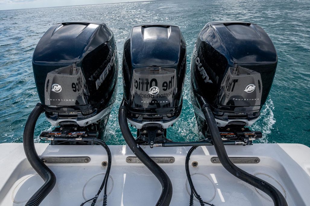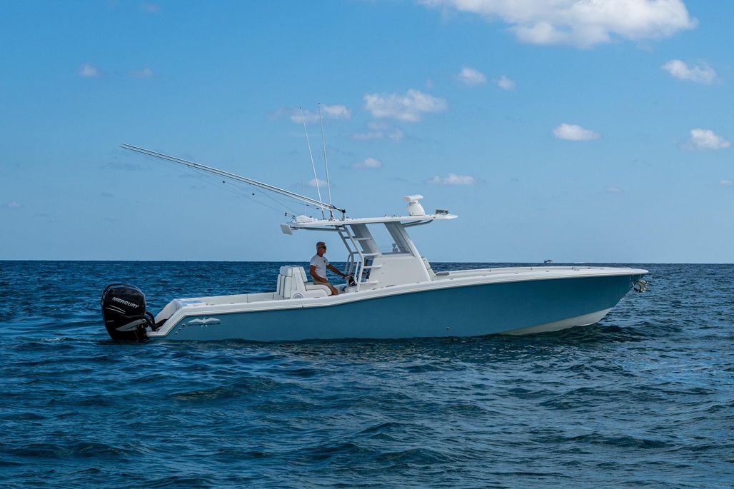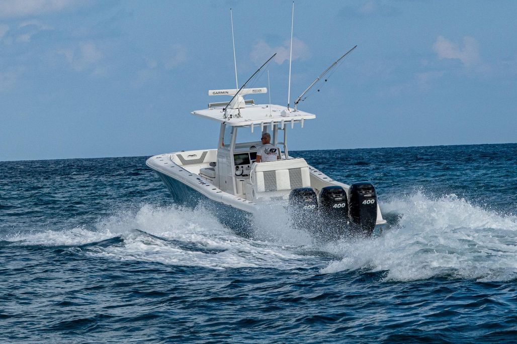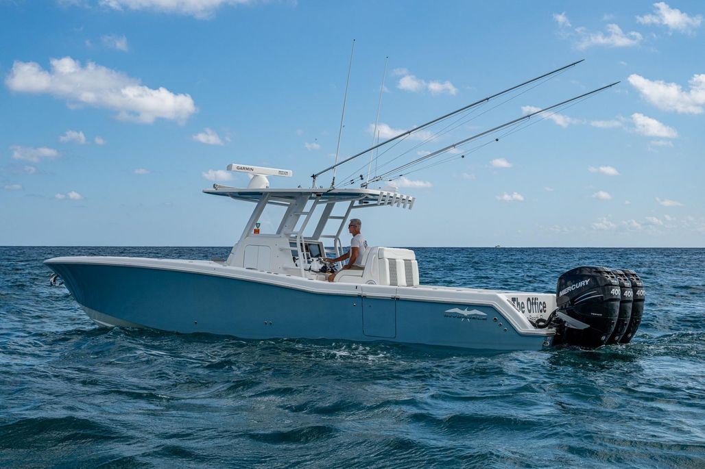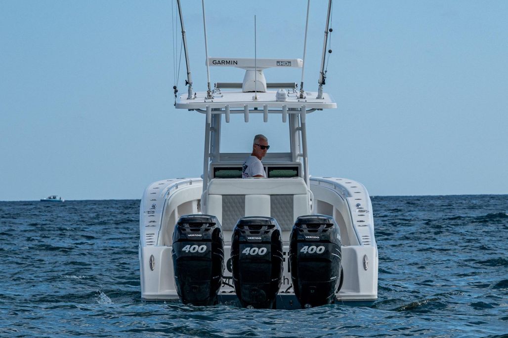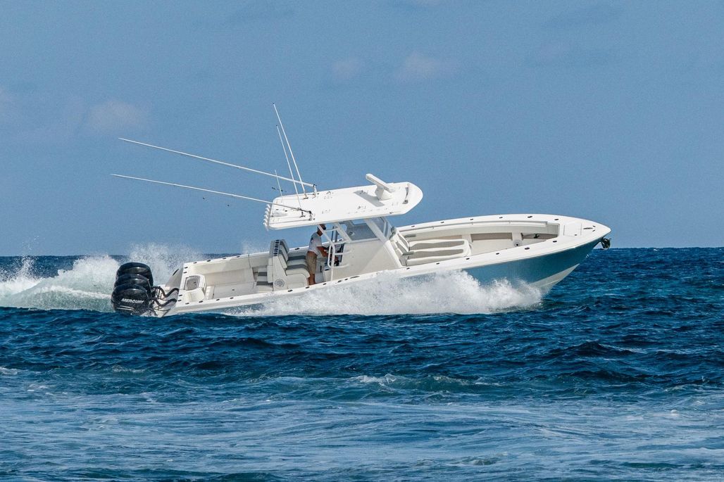 This is the OG high speed center console. The 3-400 Mercury Verado (6-cylinder supercharged) are ready to take you deep in the Bahamas. Cruising at 50 MPH at better than 1 MPG and topping out over 70, this rig is ready to run. An anchor windlass, lounge seating, and large top make sandbar days fun for the family. Dual Garmin screens and JL Audio speakers make sure you have good tunes and a clear path to navigate.