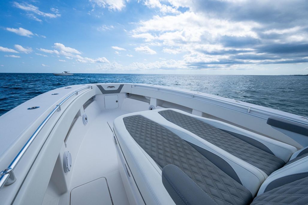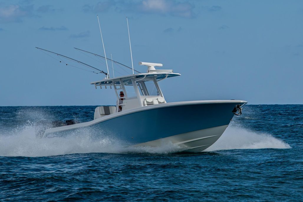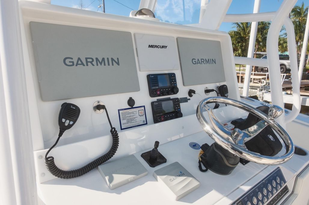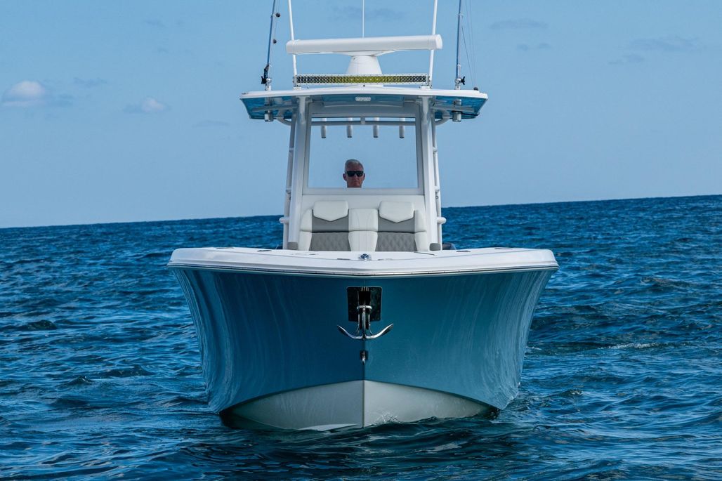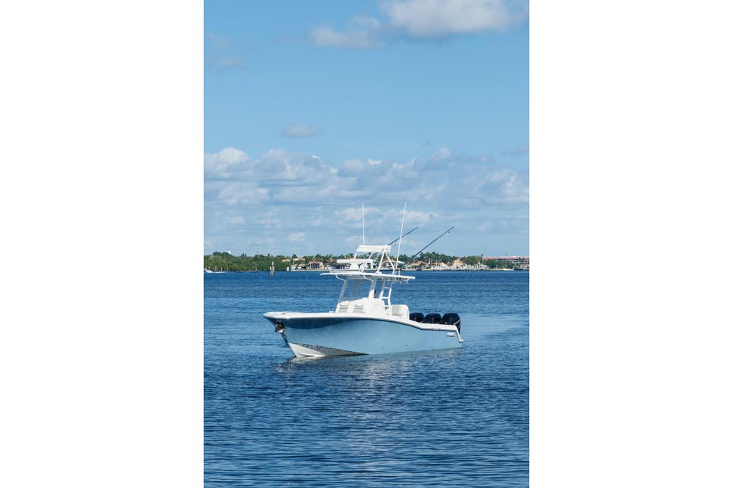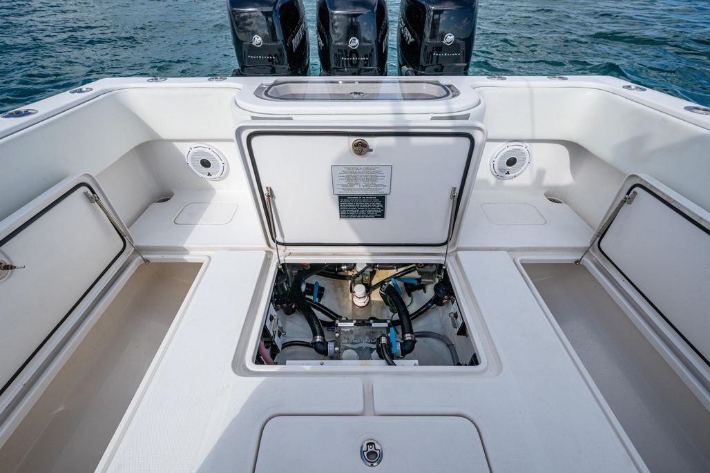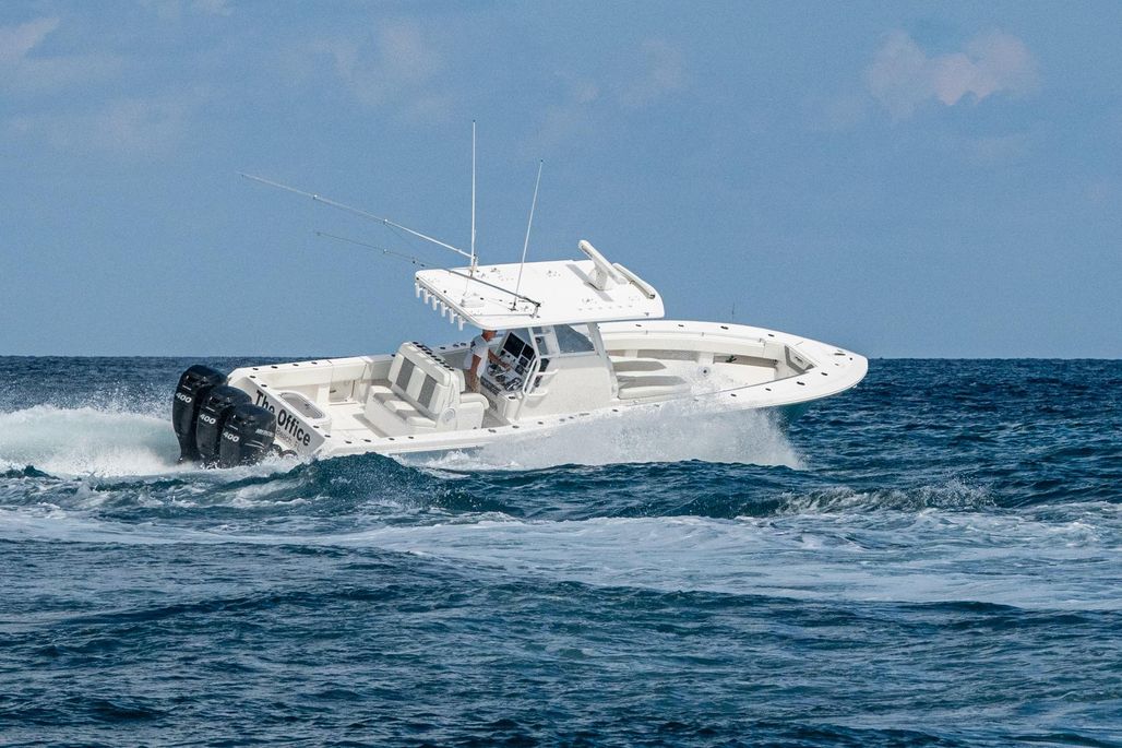 This is the OG high speed center console. The 3-400 Mercury Verado (6-cylinder supercharged) are ready to take you deep in the Bahamas. Cruising at 50 MPH at better than 1 MPG and topping out over 70, this rig is ready to run. An anchor windlass, lounge seating, and large top make sandbar days fun for the family. Dual Garmin screens and JL Audio speakers make sure you have good tunes and a clear path to navigate.