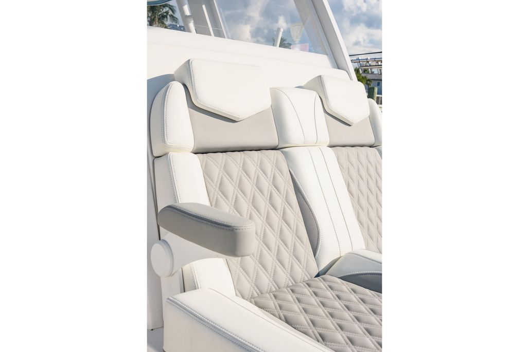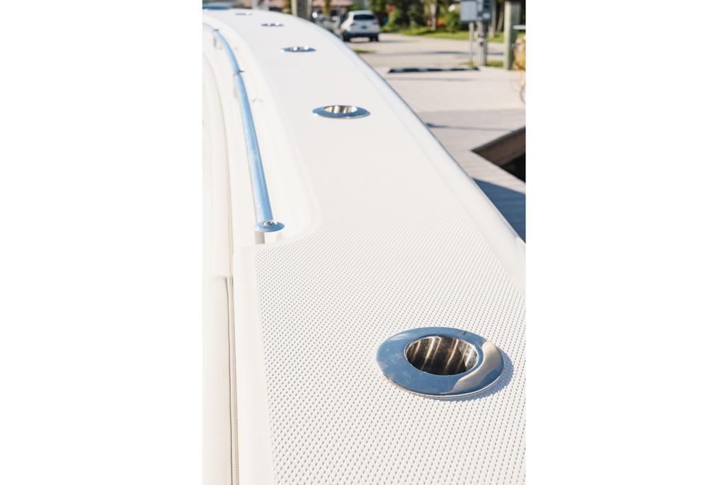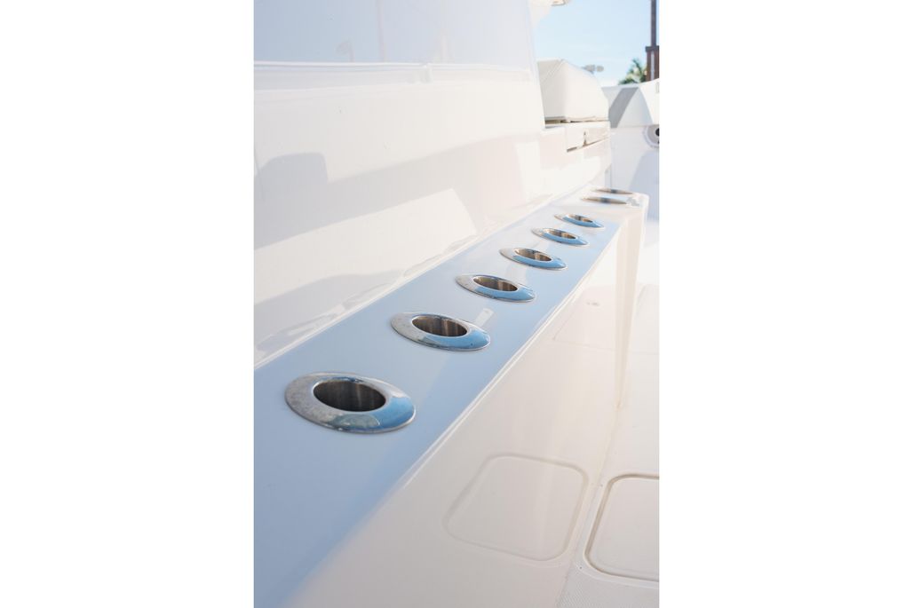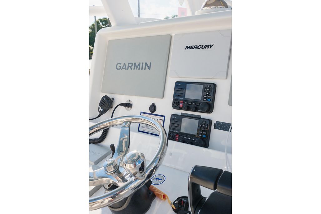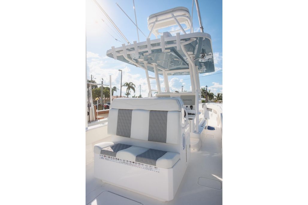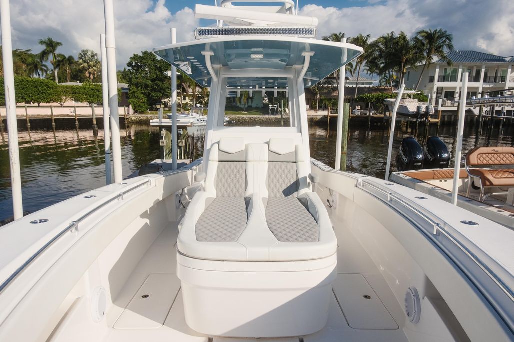 This is the OG high speed center console. The 3-400 Mercury Verado (6-cylinder supercharged) are ready to take you deep in the Bahamas. Cruising at 50 MPH at better than 1 MPG and topping out over 70, this rig is ready to run. An anchor windlass, lounge seating, and large top make sandbar days fun for the family. Dual Garmin screens and JL Audio speakers make sure you have good tunes and a clear path to navigate.