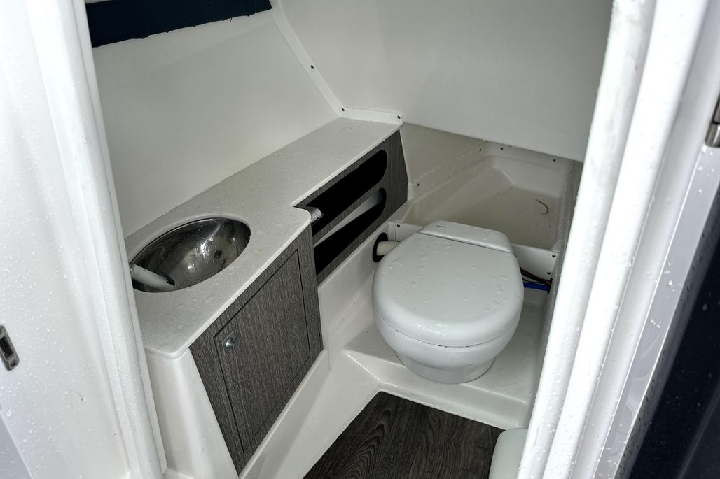 The spacious cockpit features premium upholstery, ample wraparound seating, a wet bar, and an oversized sun pad—perfect for sandbar days or sunset cruises. The enclosed head and thoughtful storage, make this boat ideal for day trips or comfortable getaways.
