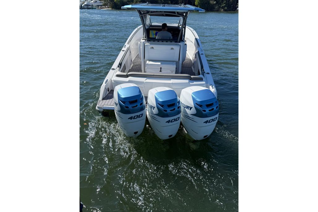 Powered by triple Mercury Verado 400s (1,200 total horsepower) with just 190 hours, this boat delivers 80+ MPH at WOT while remaining confident, composed, and incredibly smooth. She is lift-kept, never bottom painted, and shows in near-new condition throughout.
