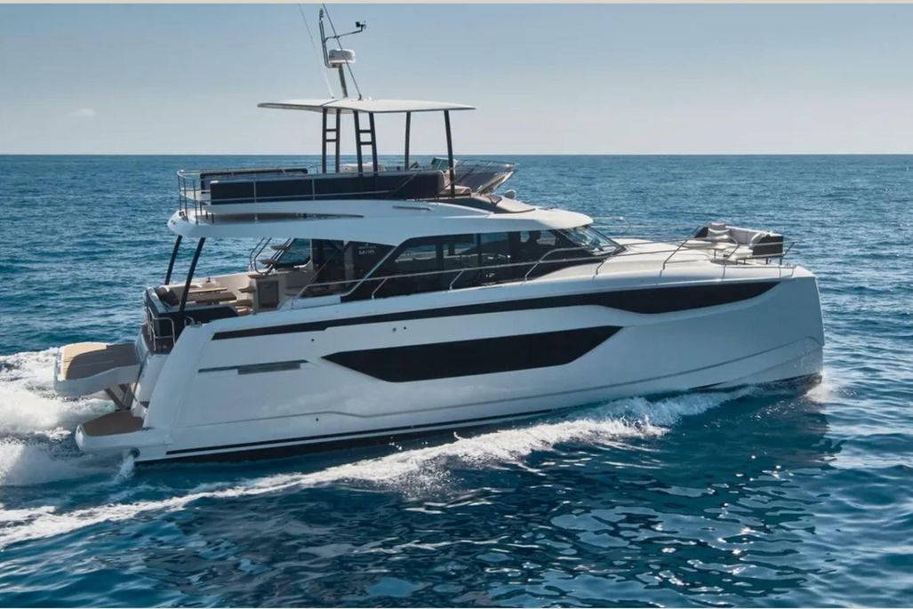 The 2023 Prestige M48 is a luxury power catamaran, Prestige's first multihull model, designed by Garroni Design and Philippe Briand. It offers spacious, light-filled interiors with three cabins, a shallow draft for accessing more remote areas, and superior stability compared to monohulls. Key features include a large flybridge, a hydraulic aft platform, and a well-appointed living space that redefines comfort at sea.