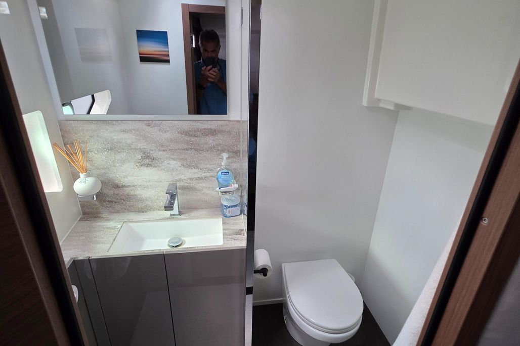 Main saloon: The saloon benefits from the catamaran's wide beam with panoramic windows, a spacious U-shaped sofa, and a central aft galley. The galley is practical and features a large fridge/freezer, induction cooktop, and an oven. A glass sliding door and a top-hinged window connect the galley to the cockpit.
