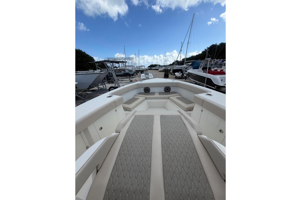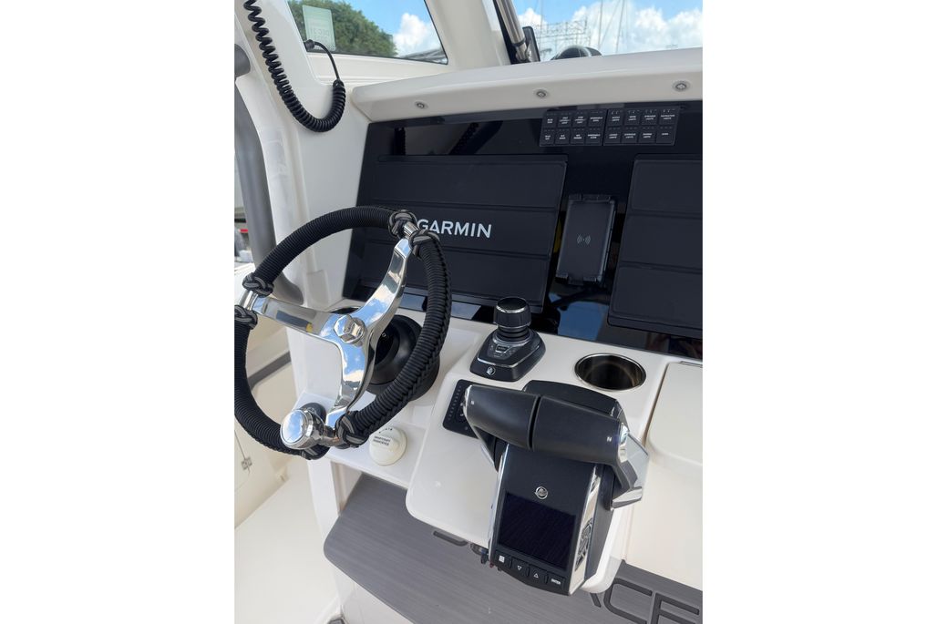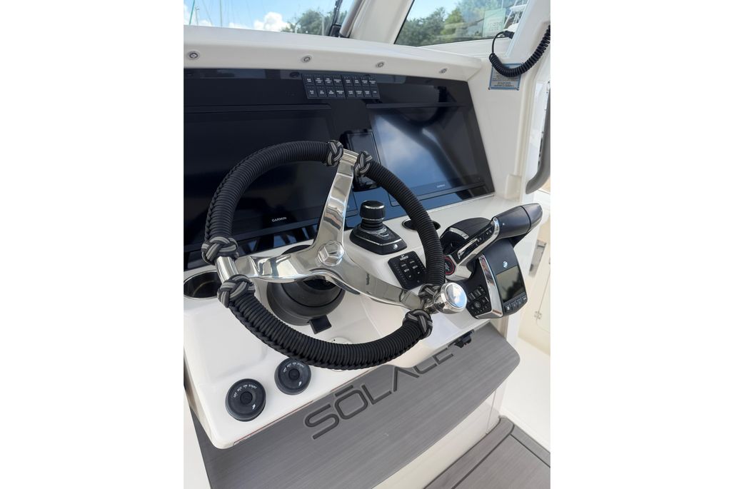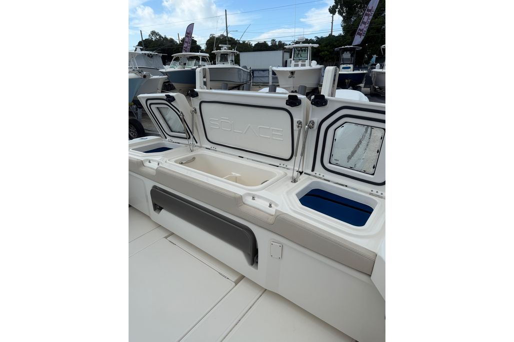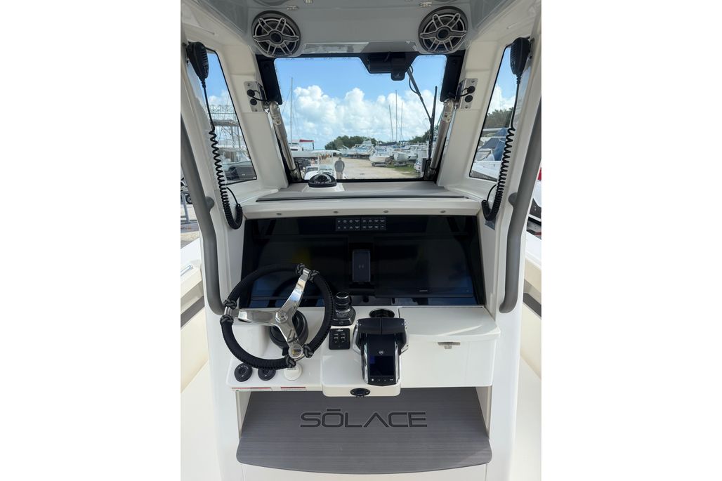 The Solace 32 is equipped with many high end options that contribute to there ultimate boating lifestyle of a vessel that is designed to fish hard and have all the amenities to cruise the islands. She has a large cabin with marine head, a great forward seating area as well as 2 comfortable helm chairs protects from the environment with the surrounding glass windshield which has the option to open. In the aft section of the boat there is a large deck allowing for sufficient room while fishing as well as a rigging table, slide out cooler, Dive door, fish boxes and two live wells.