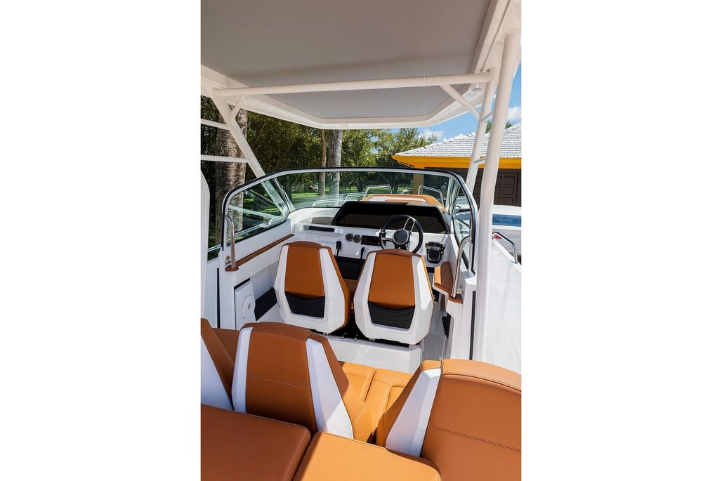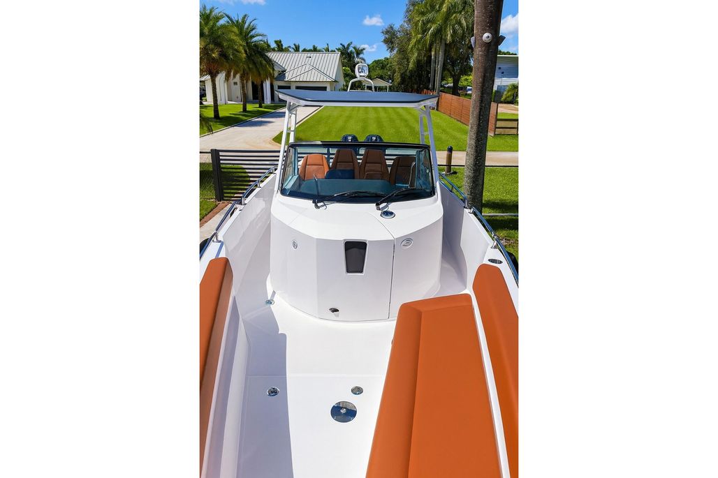 All‑weather usability: Aggressive bow flare, rigid T‑Top make this a real‑world boat, not just a pretty profile.