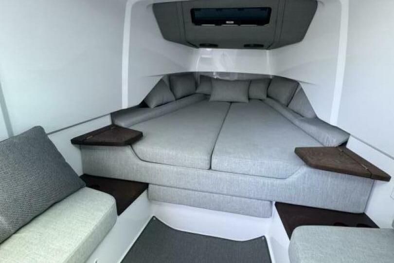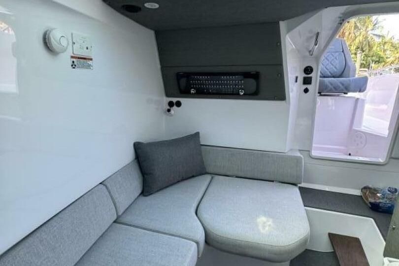 This model has multiple seating and lounging spaces along with dinning areas. The cabin has very good head room, a berth, and a hidden head.