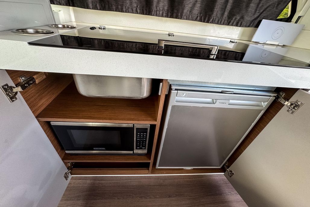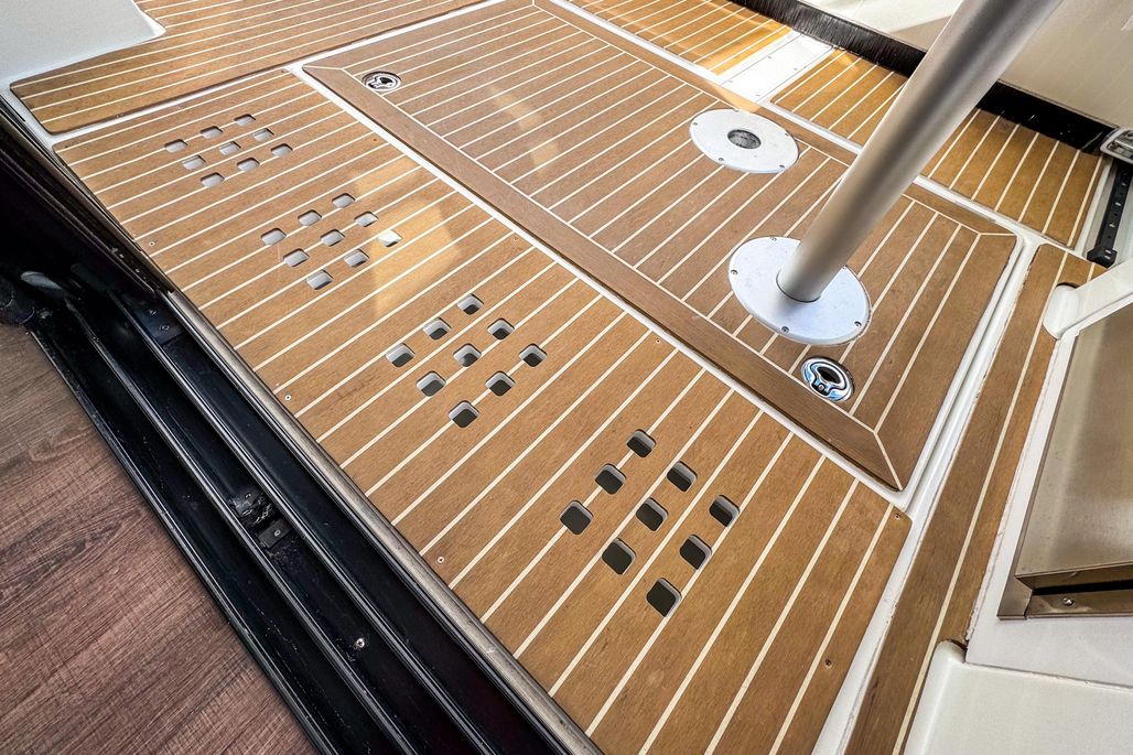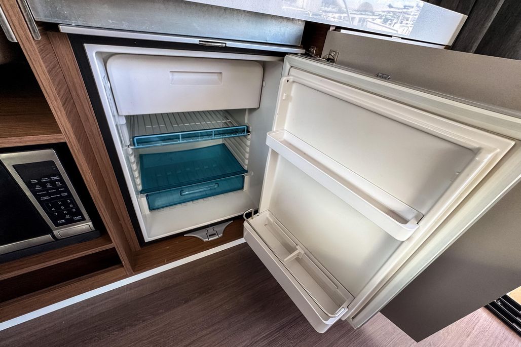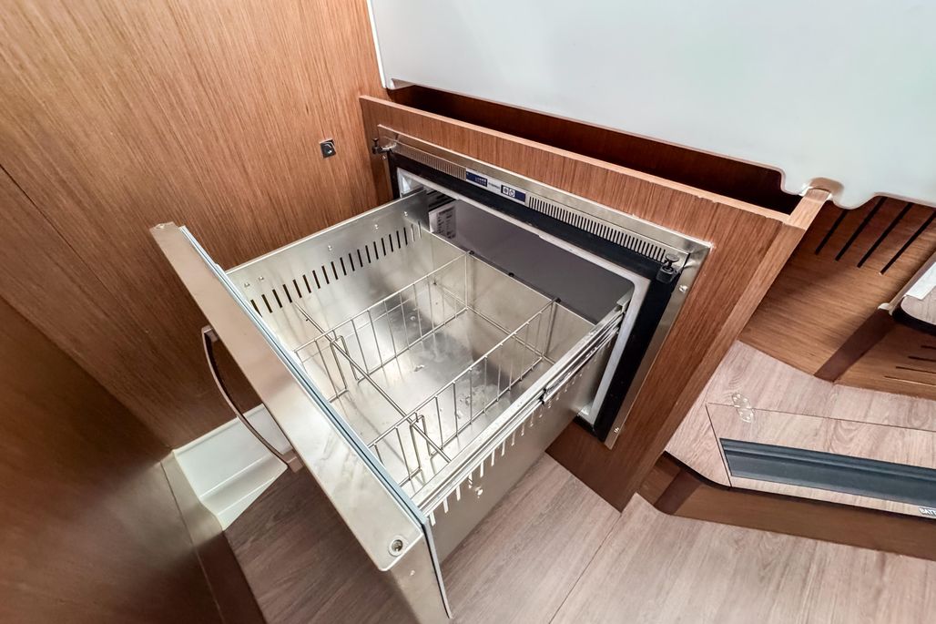 Its spacious interior is characterized by natural light and comfort, highlighted by a double master cabin with an ensuite shower room that surpasses typical standards. The full-beam aft cabin comfortably accommodates three individuals, while the salon can host up to seven guests, offering stunning panoramic views through its windows.