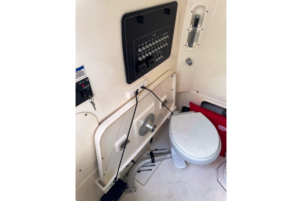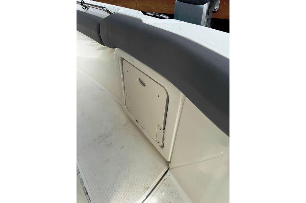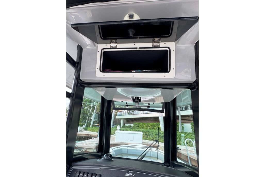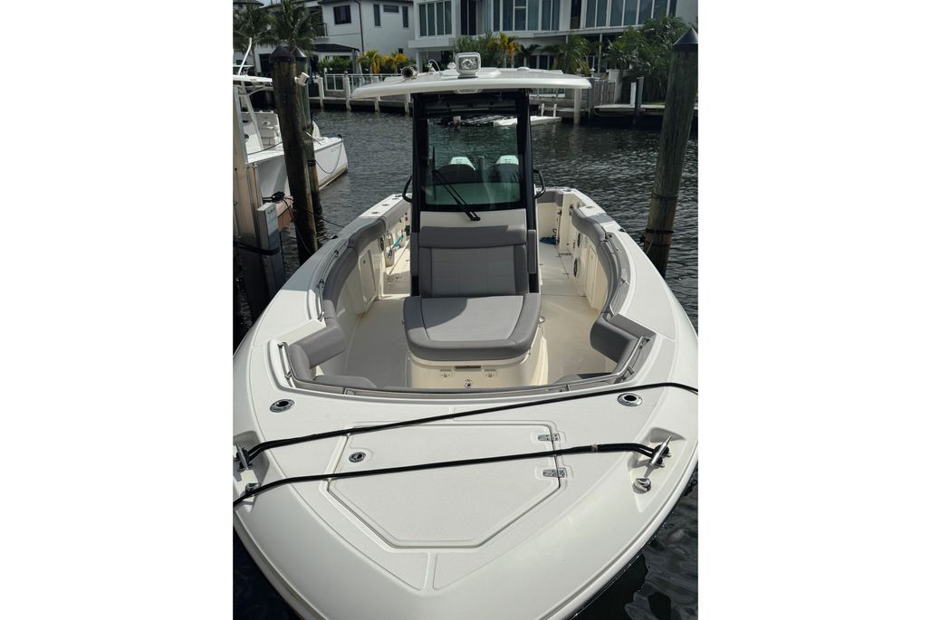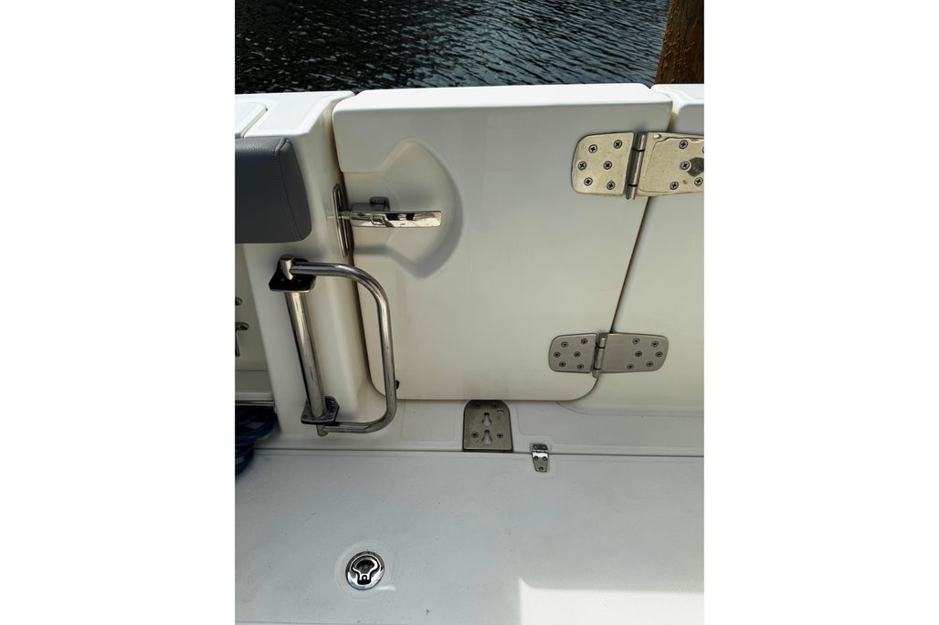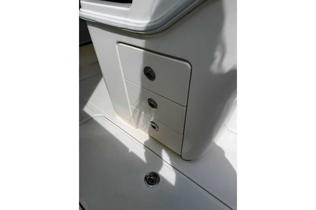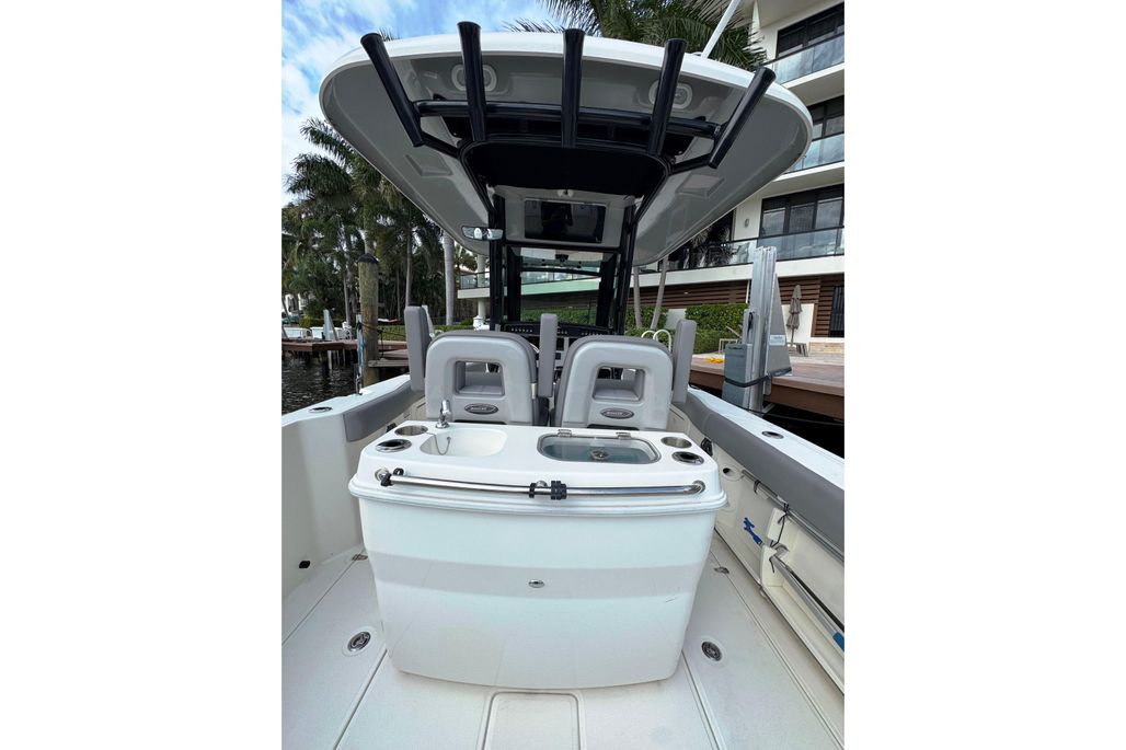 The aft cockpit is designed for versatility, with a foldaway transom bench that opens the deck for fishing or diving. A portside dive door allows effortless access to the water, while the deluxe leaning post houses a 30-gallon livewell, bait-prep station, and dual insulated fish boxes—ready for a serious day offshore.