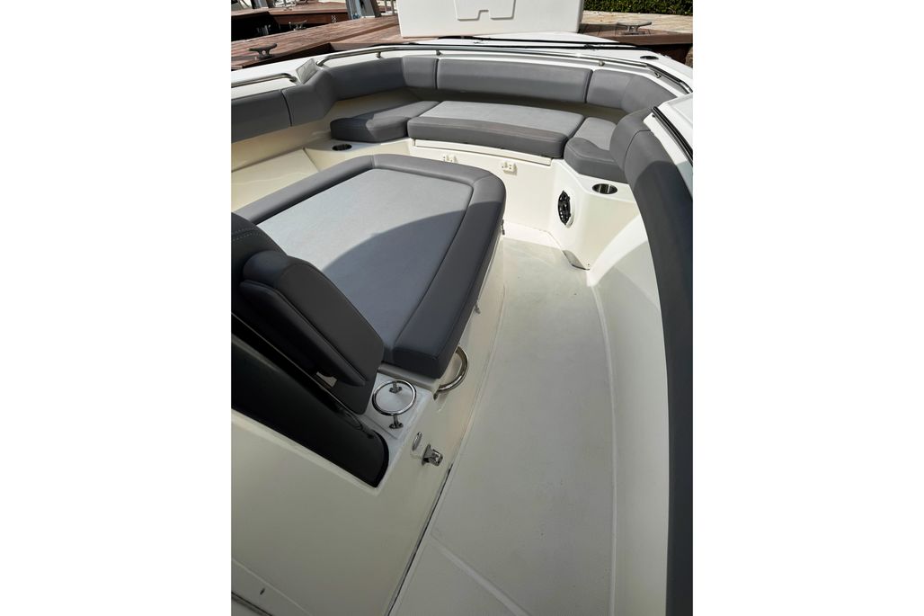- Large open bow includes a generous lounge with armrests and social-forward seating