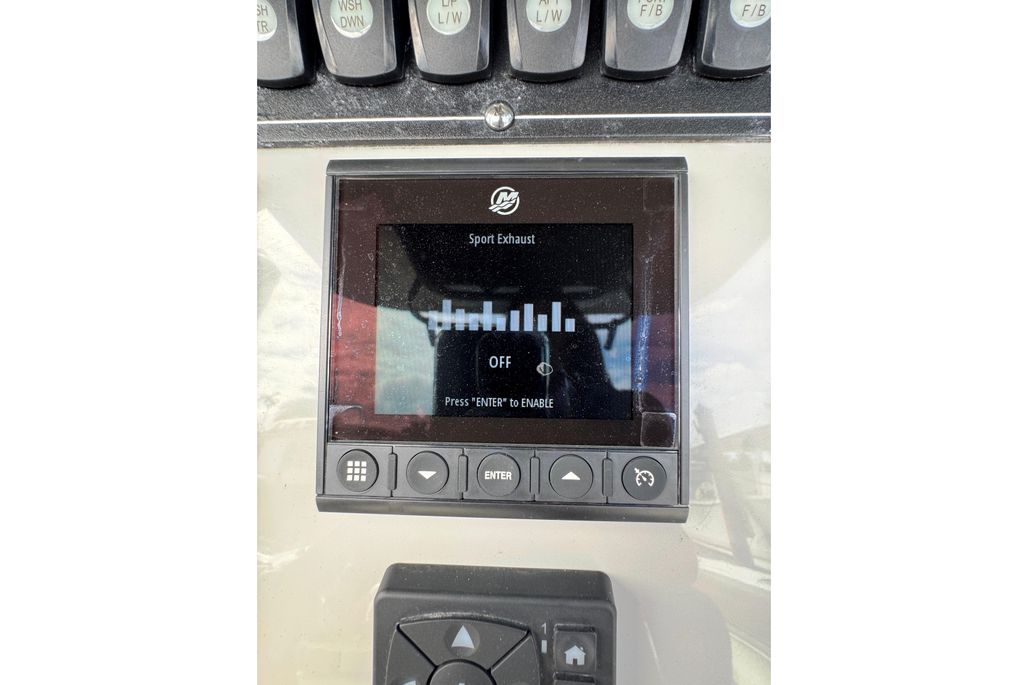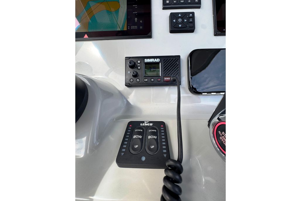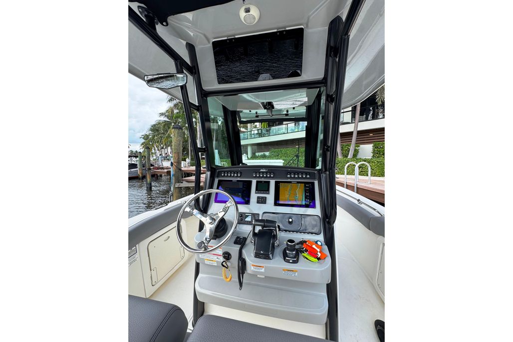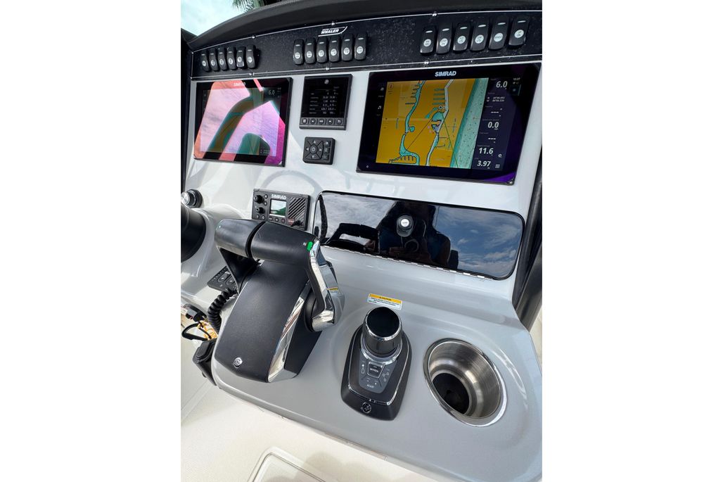 Twin Mercury engines deliver confident, smooth performance and impressive efficiency across a wide range of speeds. At the helm, dual integrated Simrad® displays provide intuitive control and precise navigation, ensuring every trip is seamless and stress-free. The deluxe helm seating includes an adjustable captain’s chair and companion seat, offering comfort for long runs offshore, while the hardtop with full-glass windshield and integrated floodlights provides protection and visibility in all conditions.