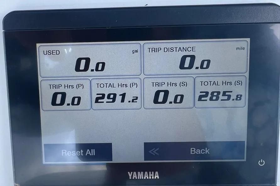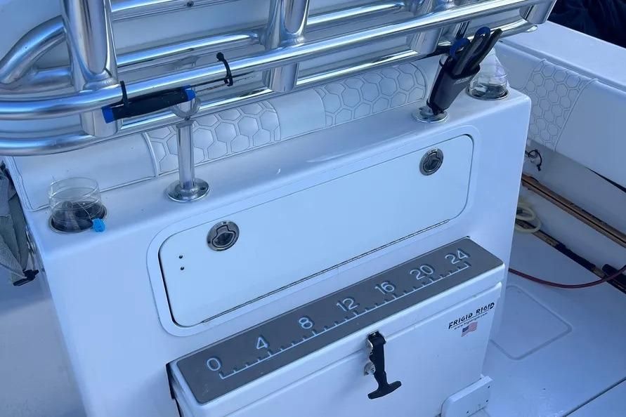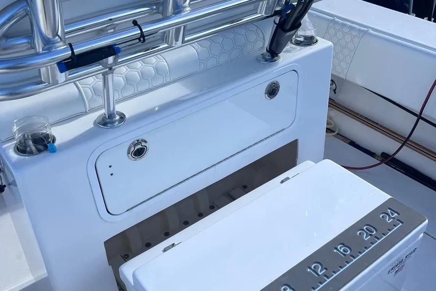 265 gal fuel across three tanks · dual pressurized livewells · 18' outriggers w/ double clips · front coffin box w/ armrests · slide-out ice chest · underwater lights · retractable dive ladder · large bow anchor locker · on-board battery charger + shore-power charger · four under-gunnel electric reel outlets · rod-holder/cupholder combos · folding aft bench seating