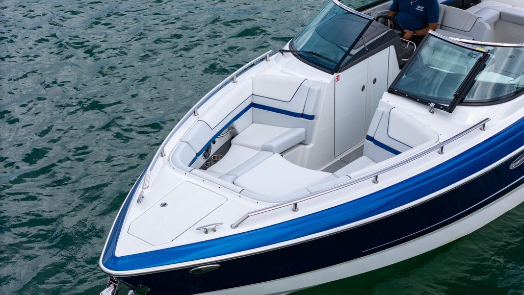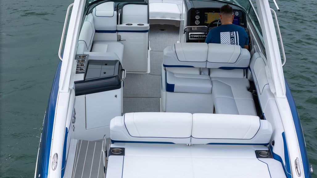 This premium bowrider features expansive seating throughout, including wraparound lounges, a double-wide helm seat, and a spacious open bow – all finished in rich marine upholstery with upscale detailing. The deep-V hull design offers a smooth, dry ride even in rougher water.