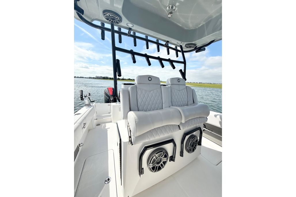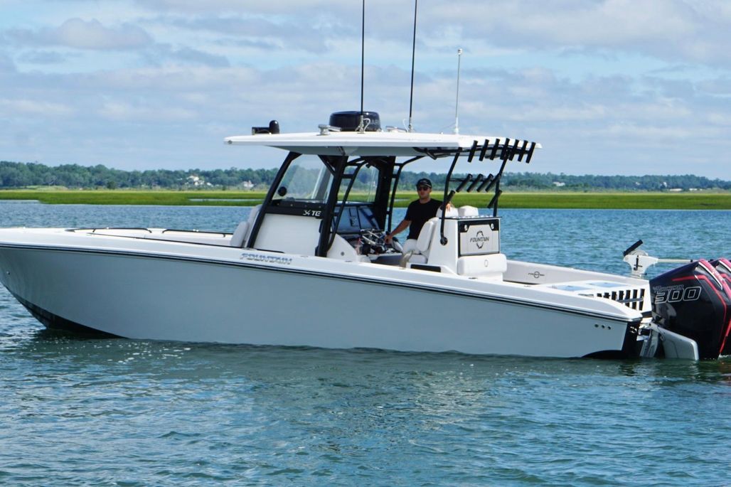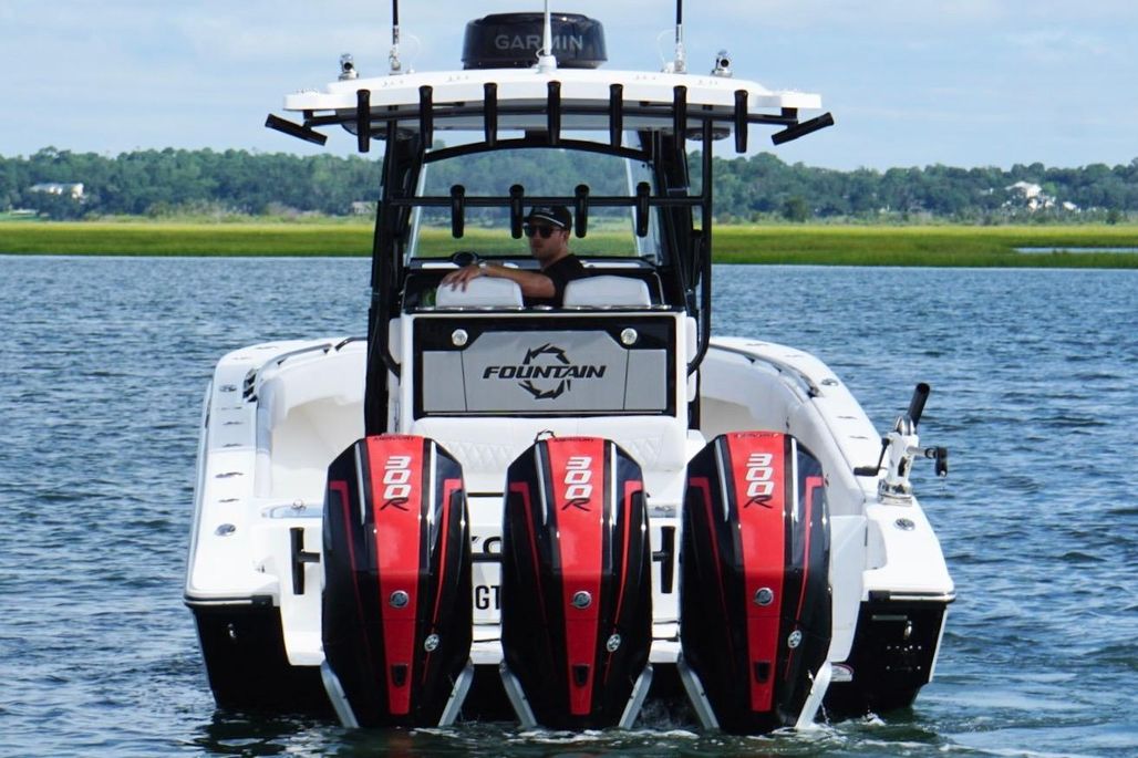 Performance, quality, and world class fishing features come together like never before in the amazing Fountain 34 Tournament Edition. An engineering marvel, the 34TE offers 360-degree movement while fighting fish, thick coaming panels, and easy access to 52-rod holders. Even if you max out, the day’s catch easily stows in five insulated in-floor lockers and a huge 380 quart coffin box cooler. Fountain’s innovative tackle center rates best-in-class. At speed, Fountain’s twin step Positive Lift bottom design is unmatched when it comes to low speed stability, fuel efficiency and big water ride control.