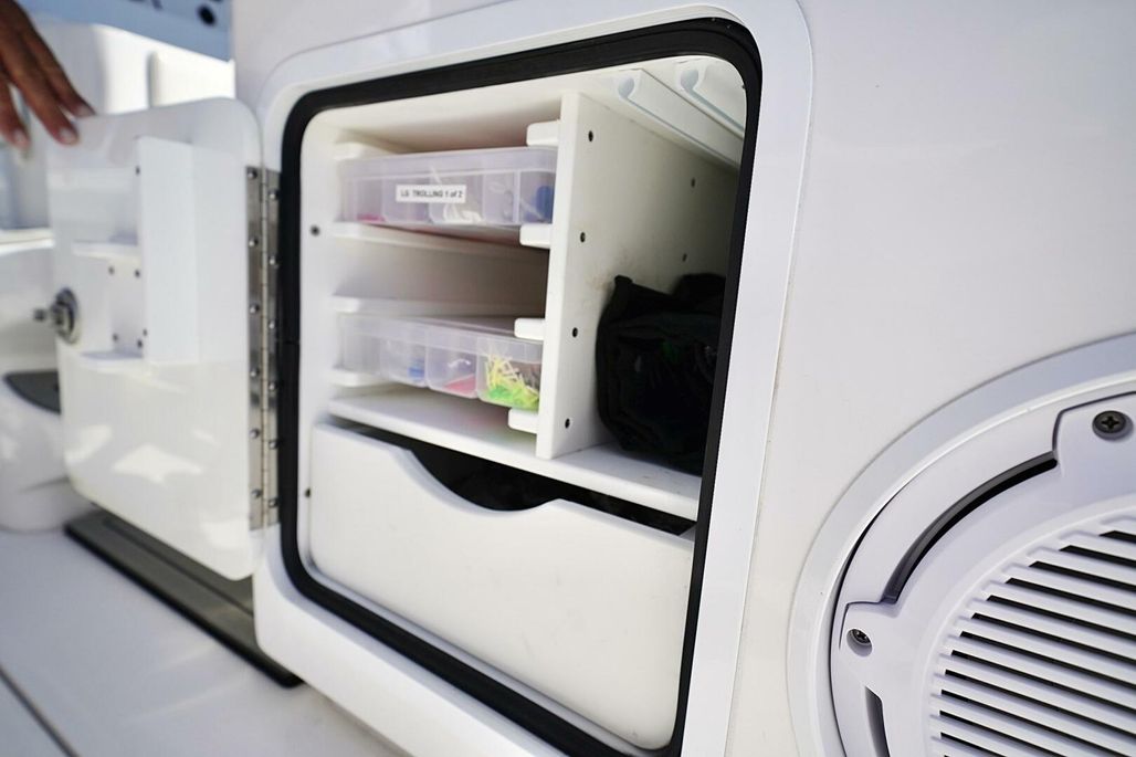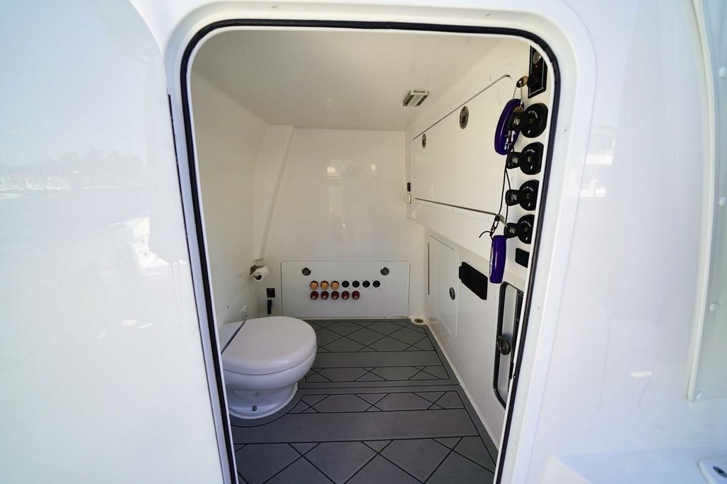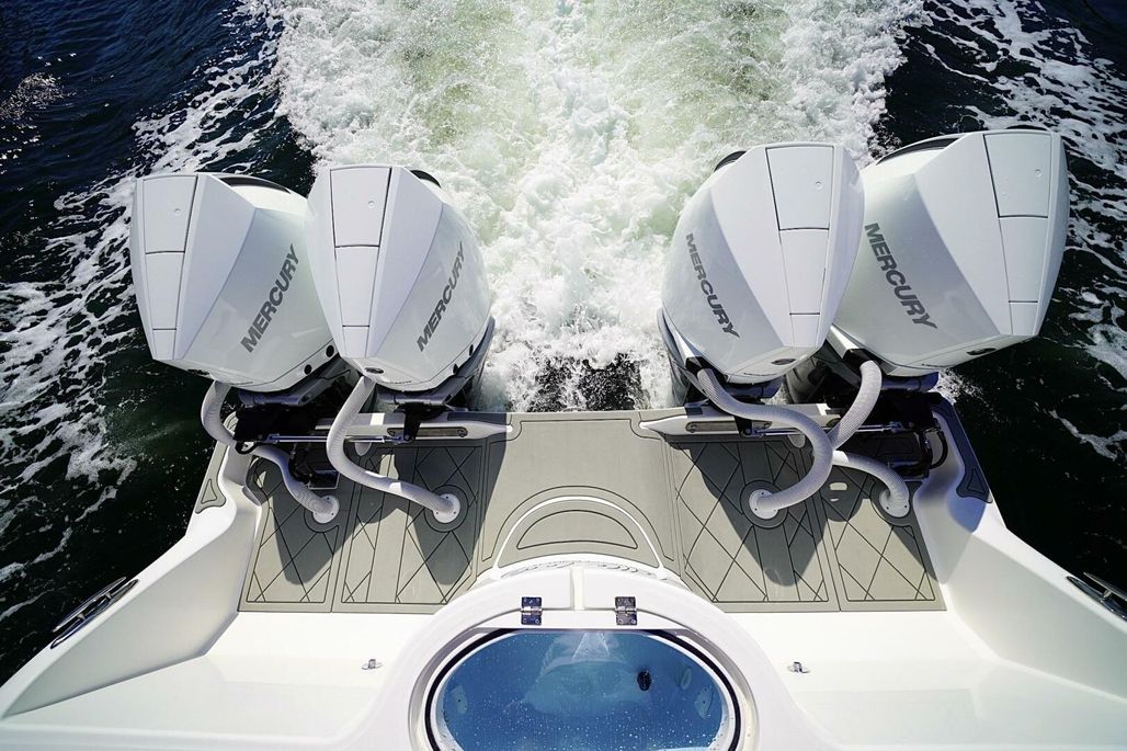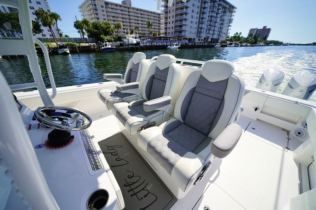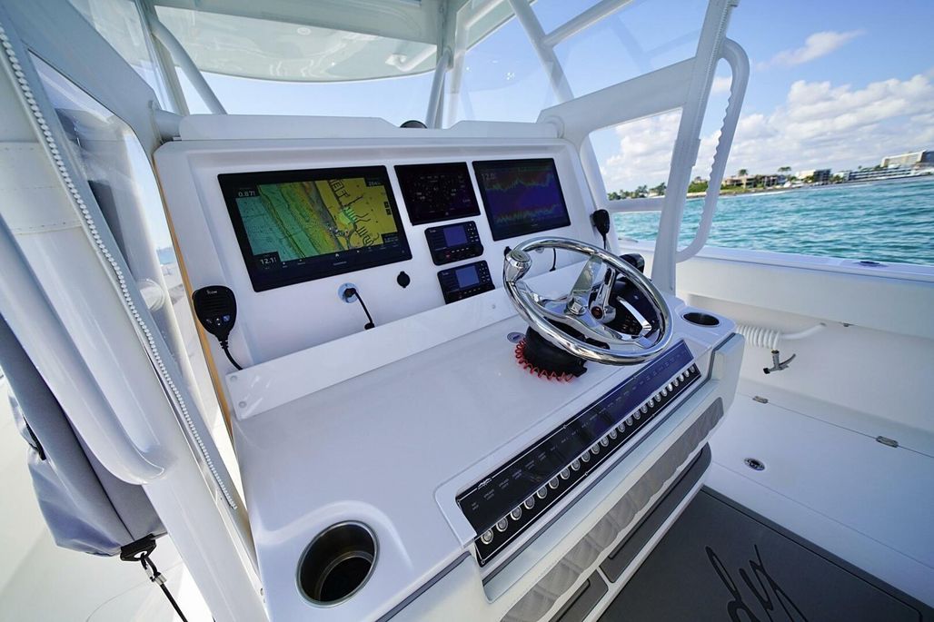 Comfort and style shine throughout with a deluxe console layout, extended coffin lounge, diamond-stitched upholstery, enclosure wings, a hull-side dive door, and premium lighting that enhances her presence day or night. Turnkey and exceptionally clean, she’s primed and ready for her next chapter of adventures on the water.