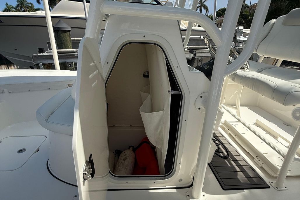 Fishing-Focused FeaturesThe 230 Bay Reef is packed with features that serious anglers demand:Ample Storage: Lockable rod storage can accommodate even your longest fly rods, and large compartments provide space for all your gear.