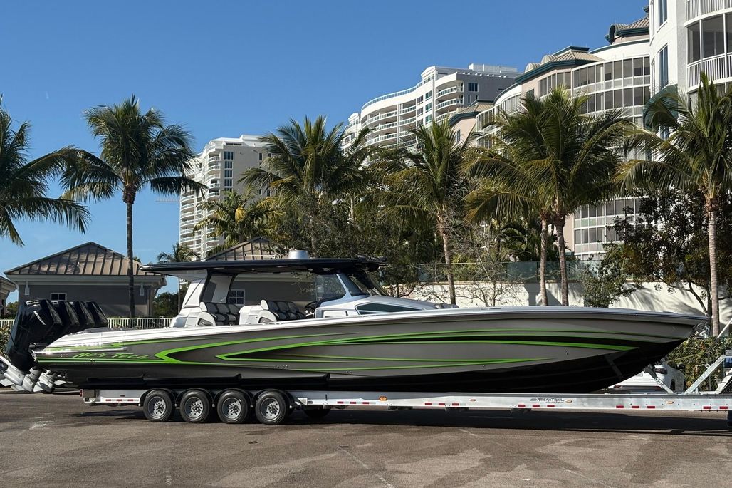 2024 500 Super Sport with a long list of options. Quad 600s, Sea Keeper and Northern Lights Generator, Extended T-TOP with 2 full rows of Seating. Complete with Bow Thruster, Twin 22" Garmins, Auto Pilot, Radar, VHF, JL Audio Sound System, Black Oak Light Bars, Remote Controlled Spotlight, Sure Shade, Twin Ice Makers, 2 Built in Coolers with Freezer Plates, Concealed Live Well, Windshield Wiper and Washer, Air Horn, Underwater Lights. Perma-Teak Synthetic Flooring, Cushioned Helm Pad, Custom Graphics, Gooseneck Trailer. Extended Engine Warranties Available. Trades Considered.