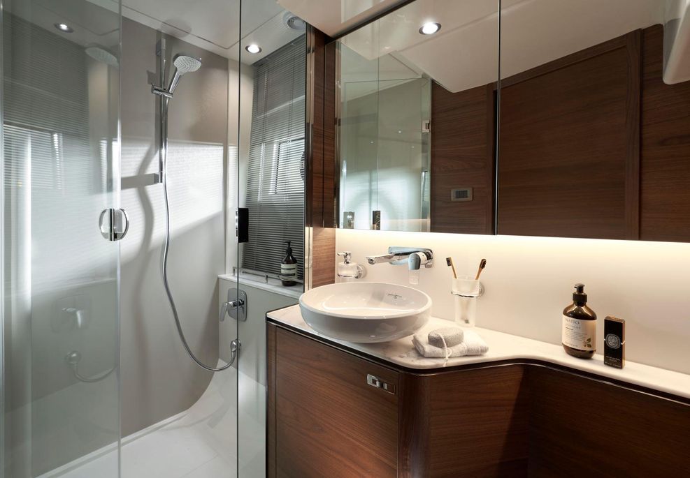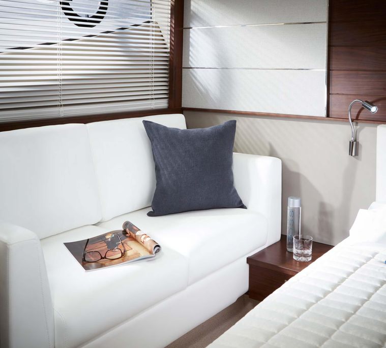 The versatile new V50 proudly features the all-new V Class exterior design. Available with open main deck configuration, her elegant style is matched only by her responsive power, reaching speeds up to 32 knots. Dynamic port light windows cascade the length of her deep-V hull, flooding the saloon and cabins with natural light. This ethos of contemporary exterior design flows through into her interior. This model features timber flooring throughout the main deck and galley areas and the twin helm seats in Nero black leather are a new signature across the V Class range.