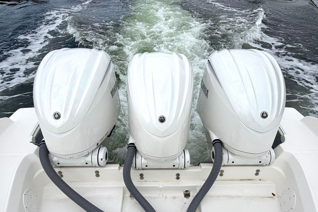 Introducing this one owner 2024 Pursuit DC 365 Dual Console, sold new by us. a remarkable vessel that combines elegance and performance. With an overall length of 37'11"feet, this boat is designed for both leisure and adventure on the water. The deep Vee hull, crafted from fiberglass, ensures a smooth and stable ride, perfect for cruising in various conditions. Powered by three robust Yamaha F300 outboard engines, each delivering 300 horsepower, this boat promises exhilarating speed and agility. With only 79 current hours of use and Yamaha Warranty till 8/30/2029 she is ready for your next journey. The interior features a cozy cabin with A/C and a well-appointed head, enhancing comfort during extended outings. Notably, the Helm Master Ex Joystick control system adds ease to maneuvering, making docking and navigation a breeze. Experience the perfect blend of luxury and functionality with the Pursuit DC 365, where every detail is designed for unforgettable moments on the water.