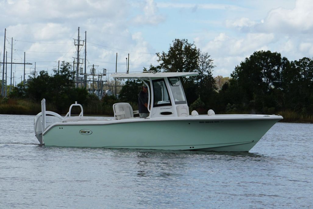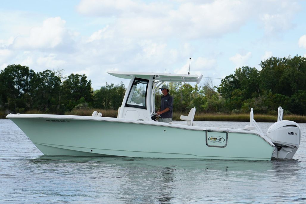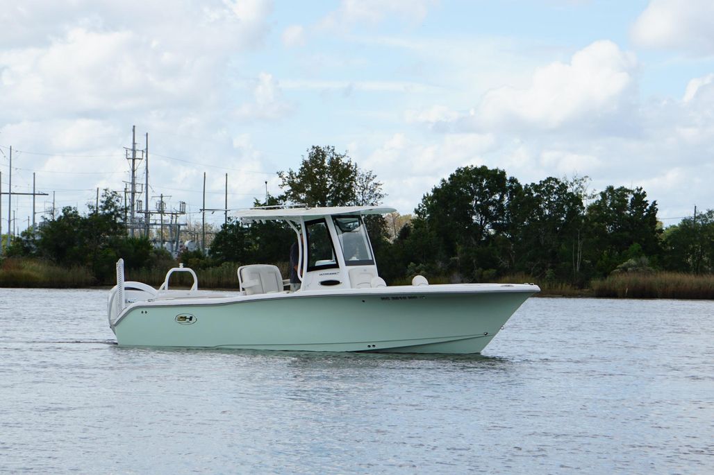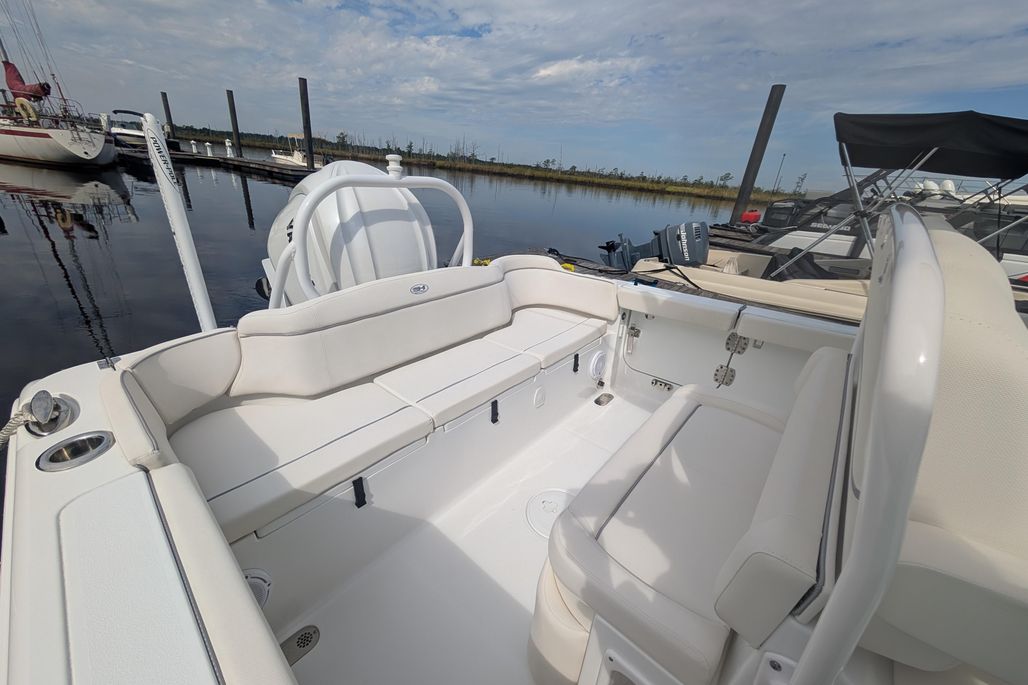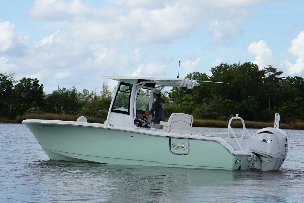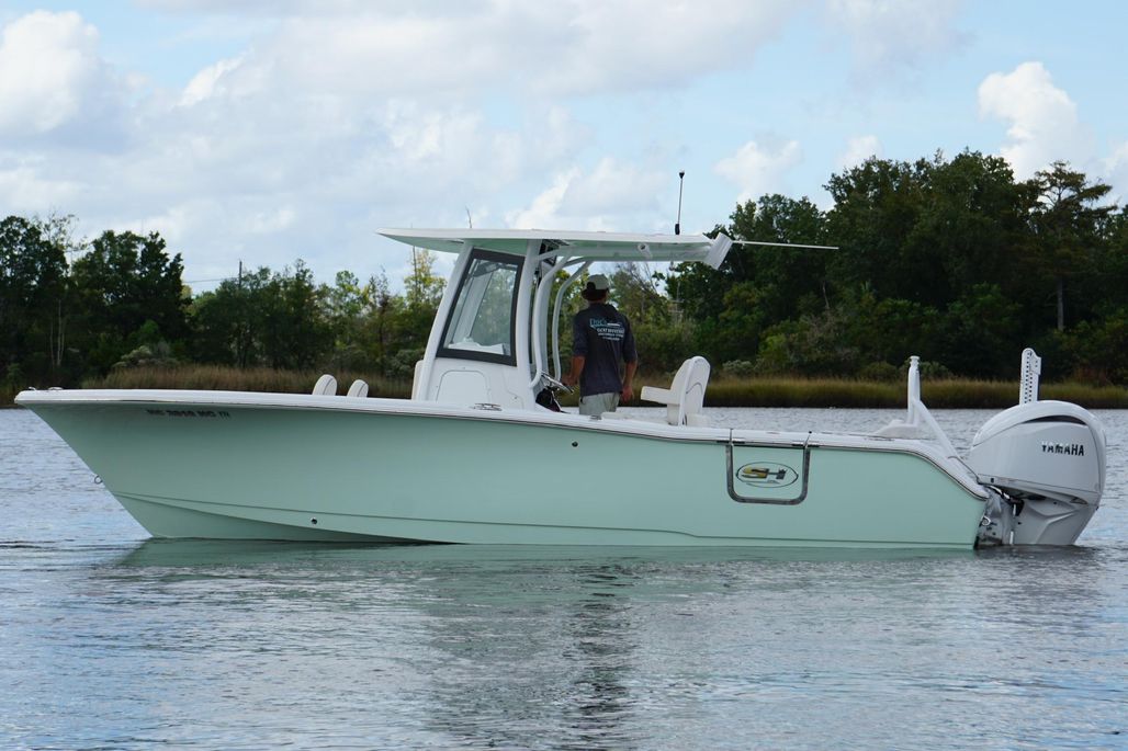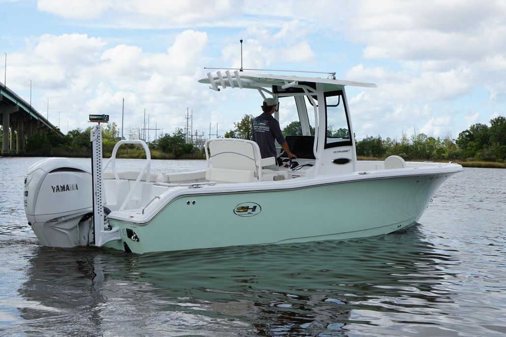 Finished in Abaco Green full hull color (with matching T-top underside and deleted waterline striping), this 255 SE shows beautifully inside and out. The white/grey upholstery and powder-coated hardware complete the clean, modern look Sea Hunt is known for.