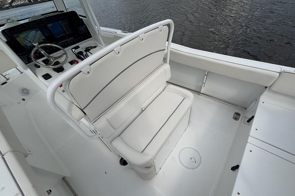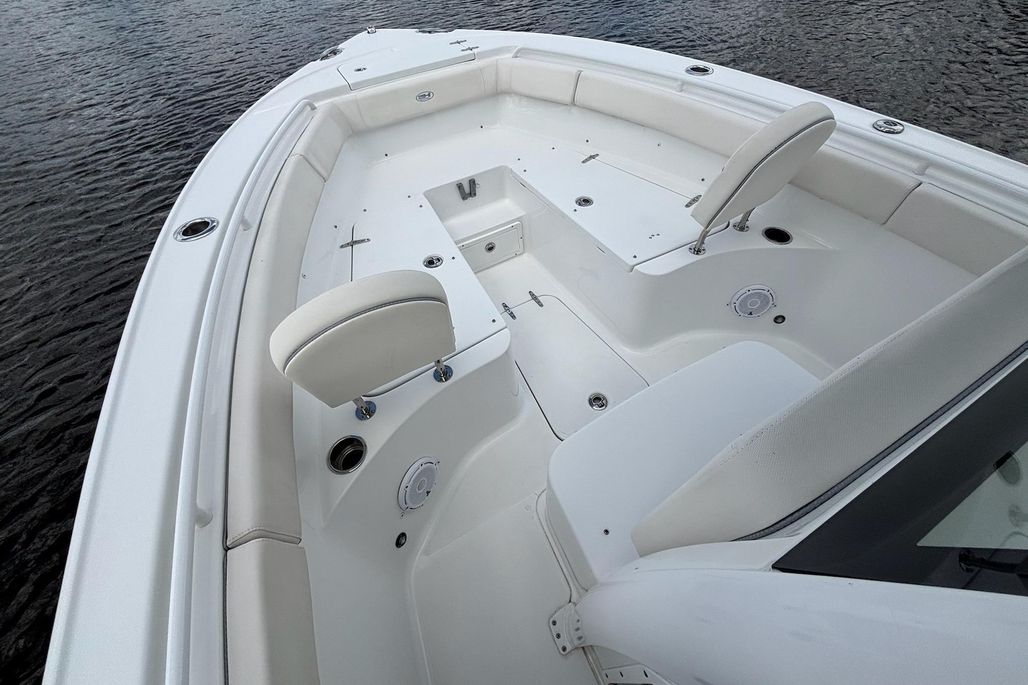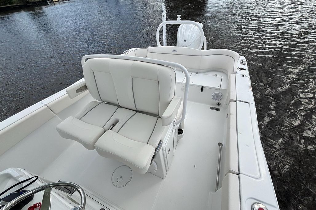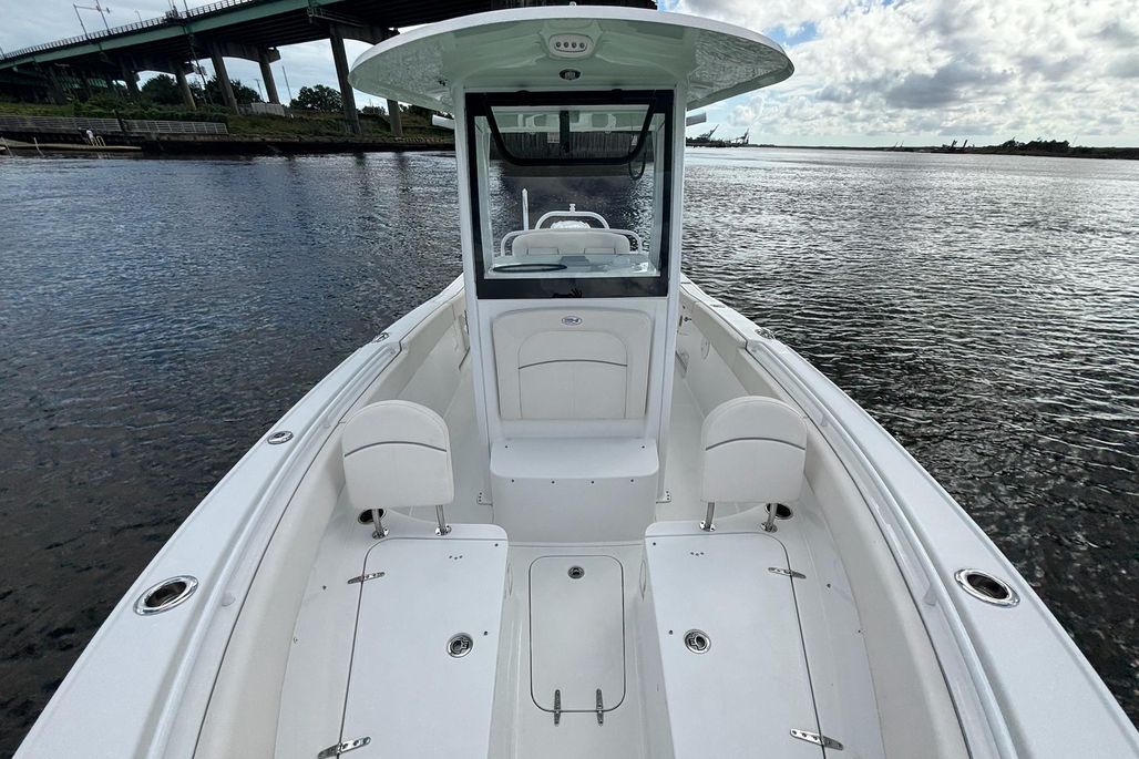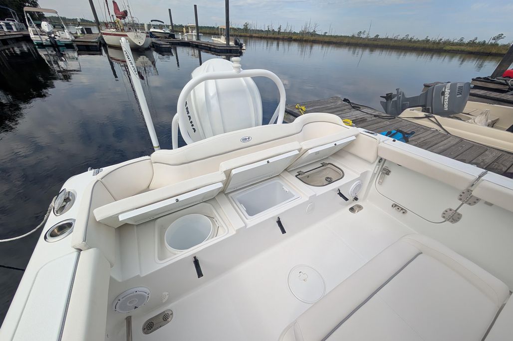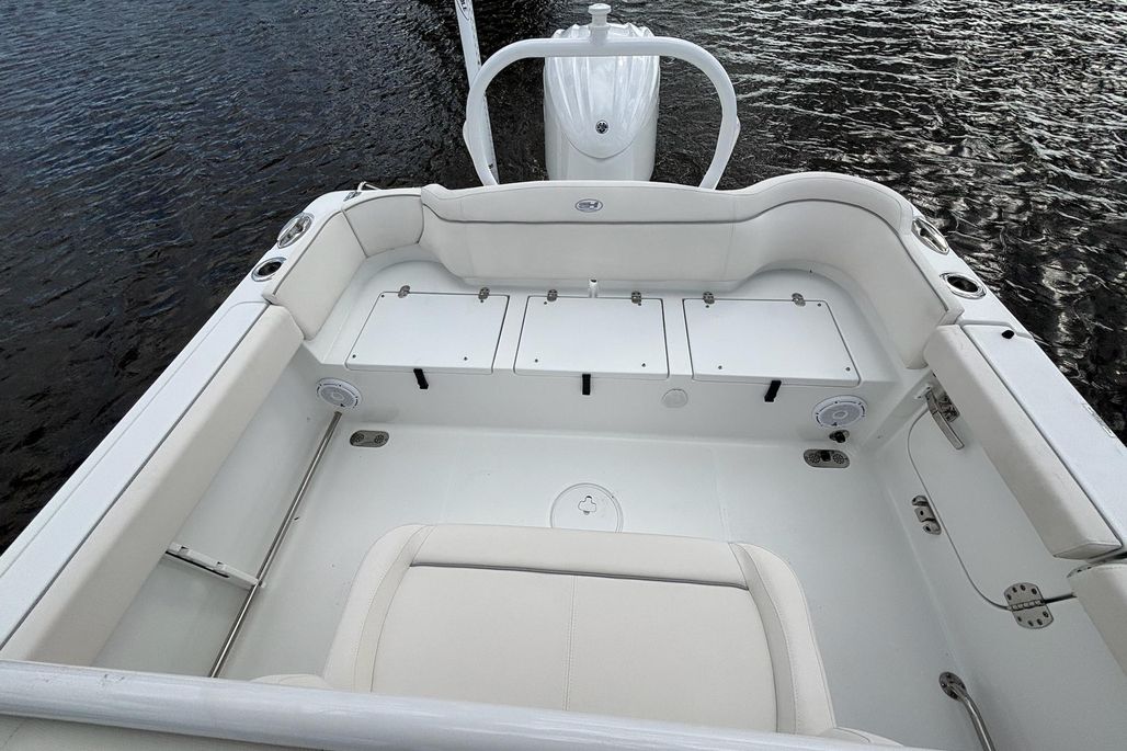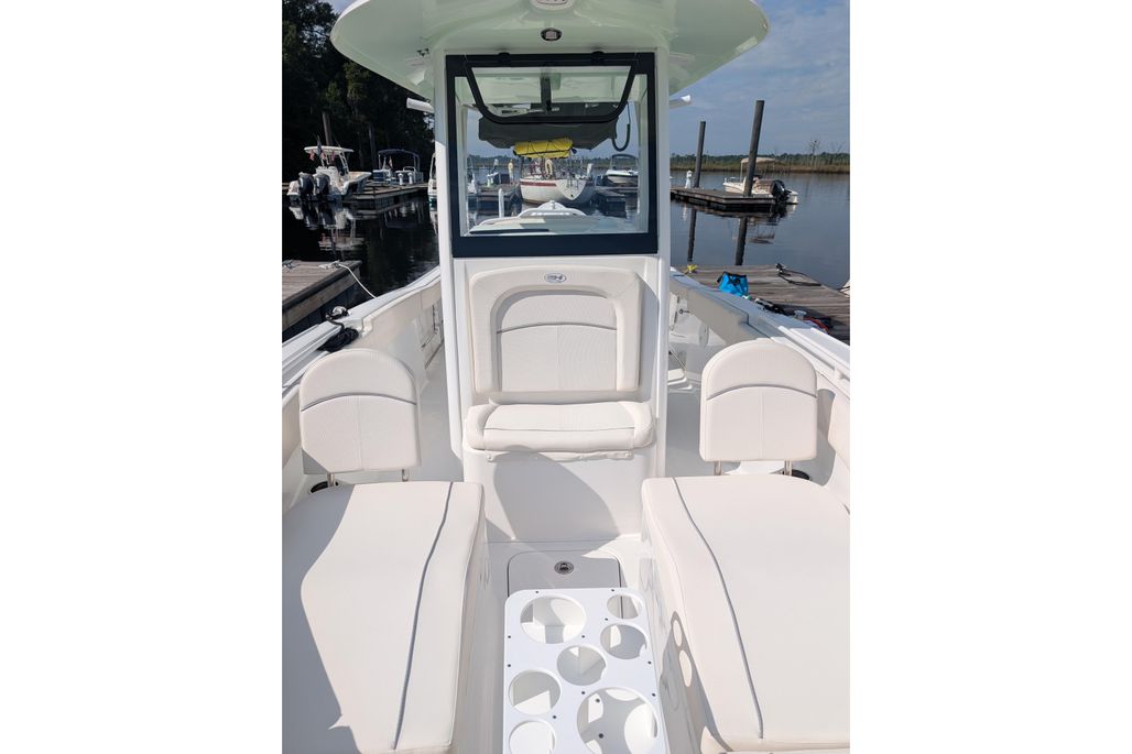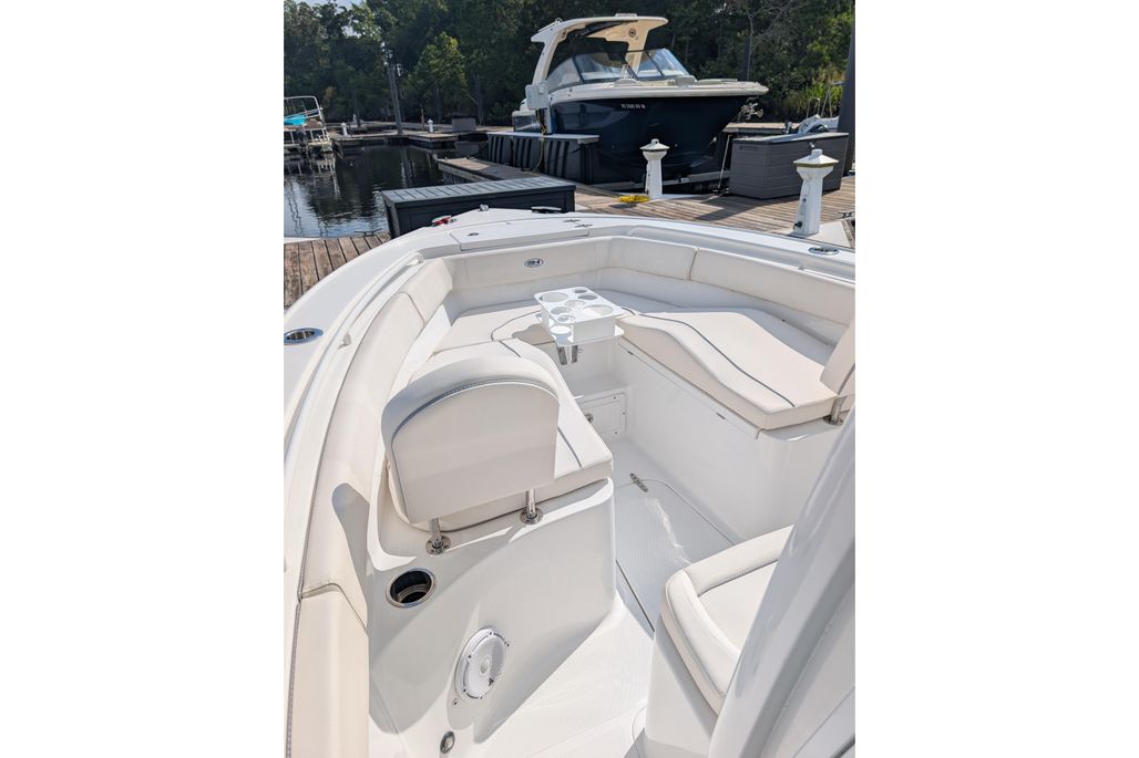 Finished in Abaco Green full hull color (with matching T-top underside and deleted waterline striping), this 255 SE shows beautifully inside and out. The white/grey upholstery and powder-coated hardware complete the clean, modern look Sea Hunt is known for.