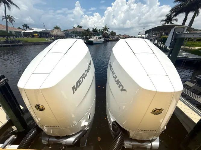 Powerful Performance: Equipped with twin Mercury V10 400 outboards (800 HP total) for exhilarating speed and smooth handling, complete with Mercury Helm Master EX for precision control. 100 hour service just completed.