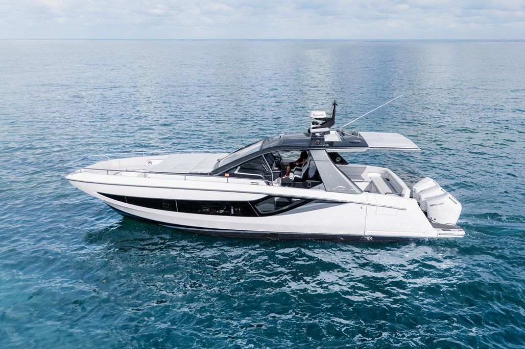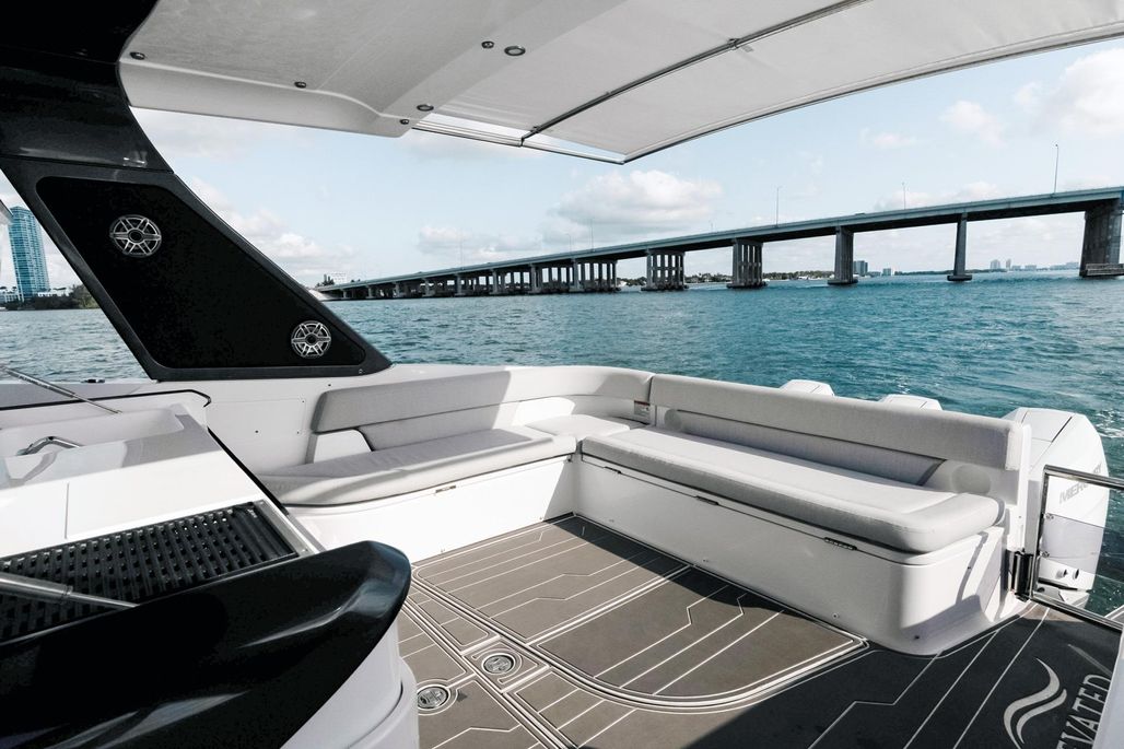 Powered by triple Mercury V10 400 HP outboards, she delivers impressive speed, responsive handling, and shallow-draft versatility. The open deck layout is ideal for entertaining, with generous bow seating, an aft cockpit dining area, and seamless flow between helm and social spaces.
