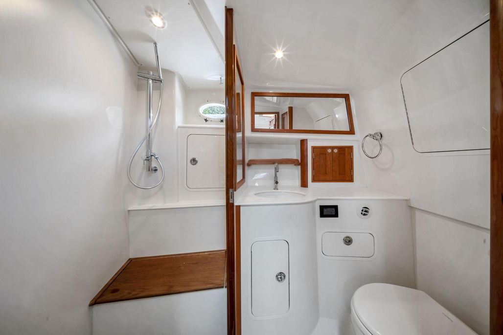 - Oversized head with stall shower and automatic sump pump separated with bi-fold Lexan doors, hot and cold pressure water, molded sink , freshwater toilet with Y-valve, towel rack, clothes hooks, wet hanging locker, and mirrored doors.