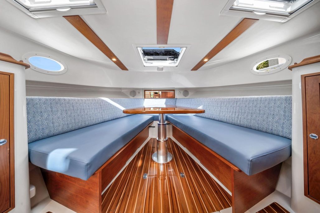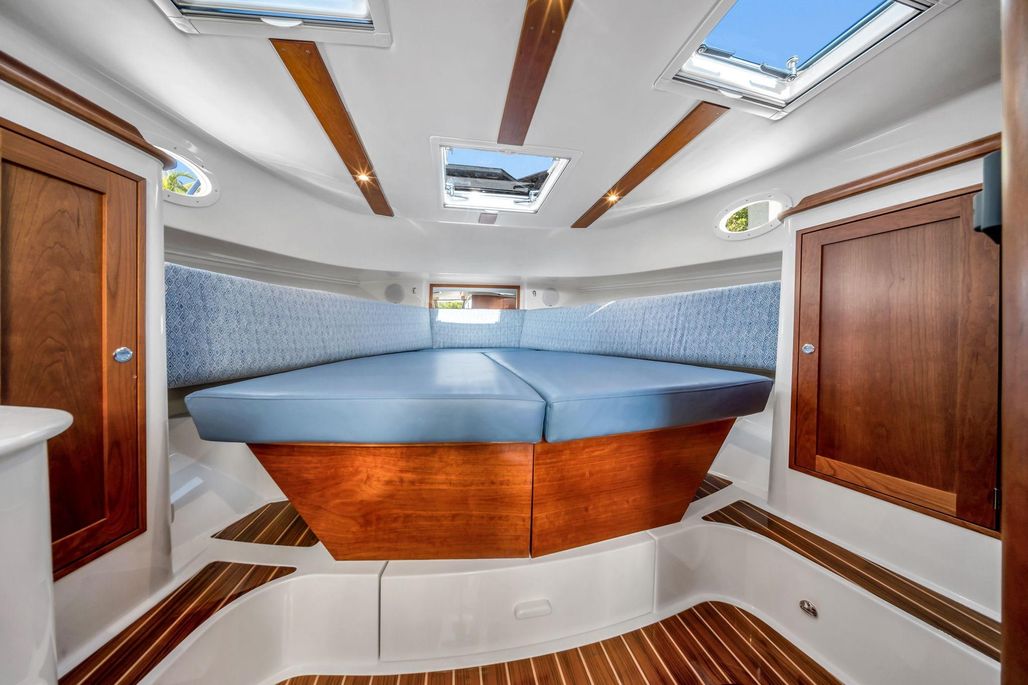 - Optional Premium Fabric aft berth/settee cushions: Sunbrella Canvas Sapphire Blue berth; Ultraleather Coast Beacon with Luxor Leather French Blue piping settee\