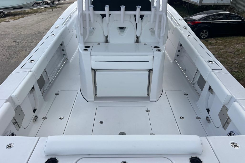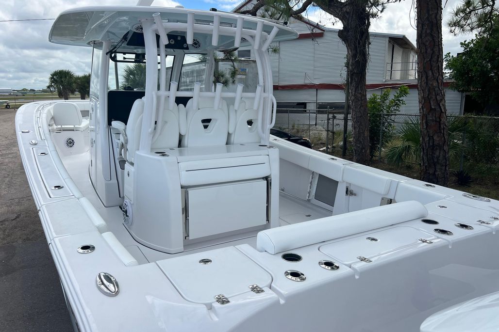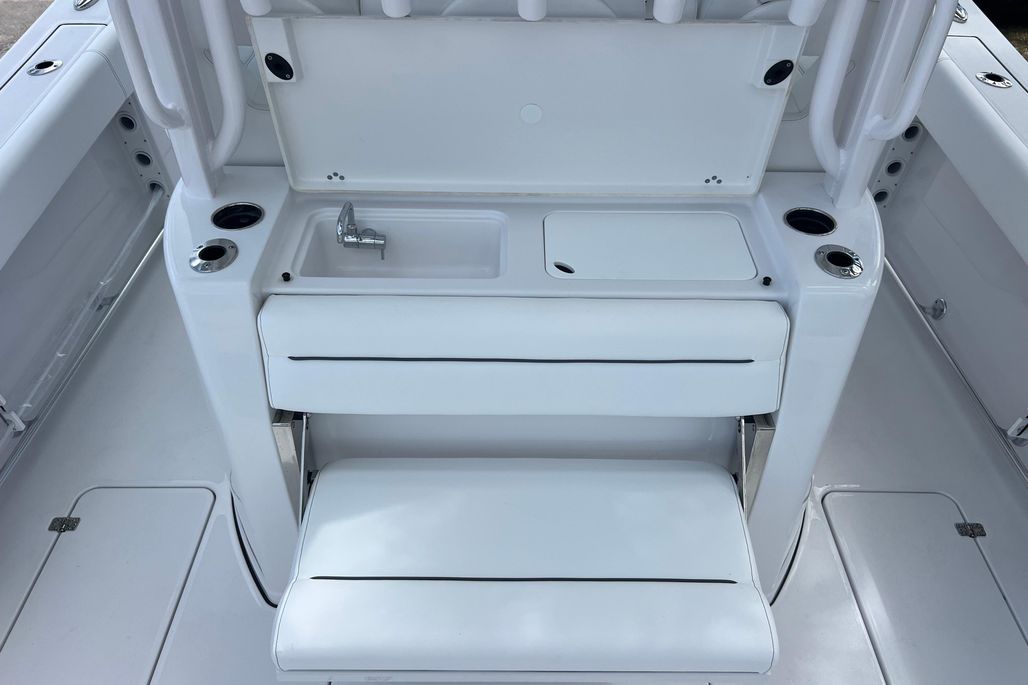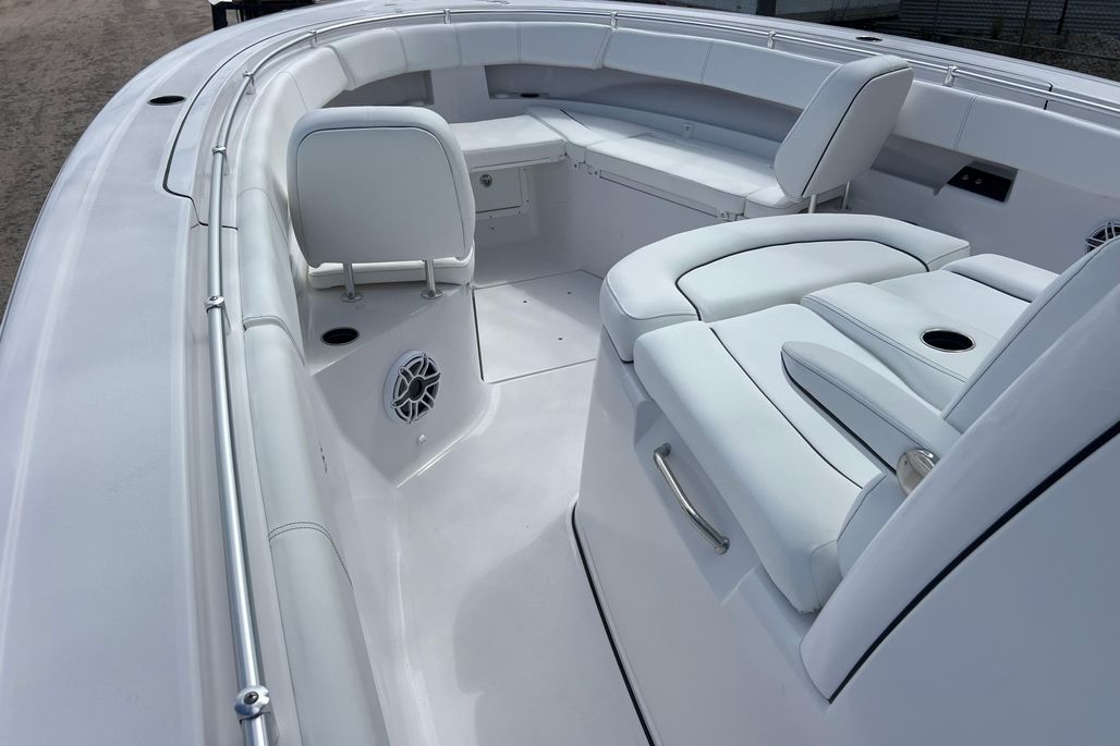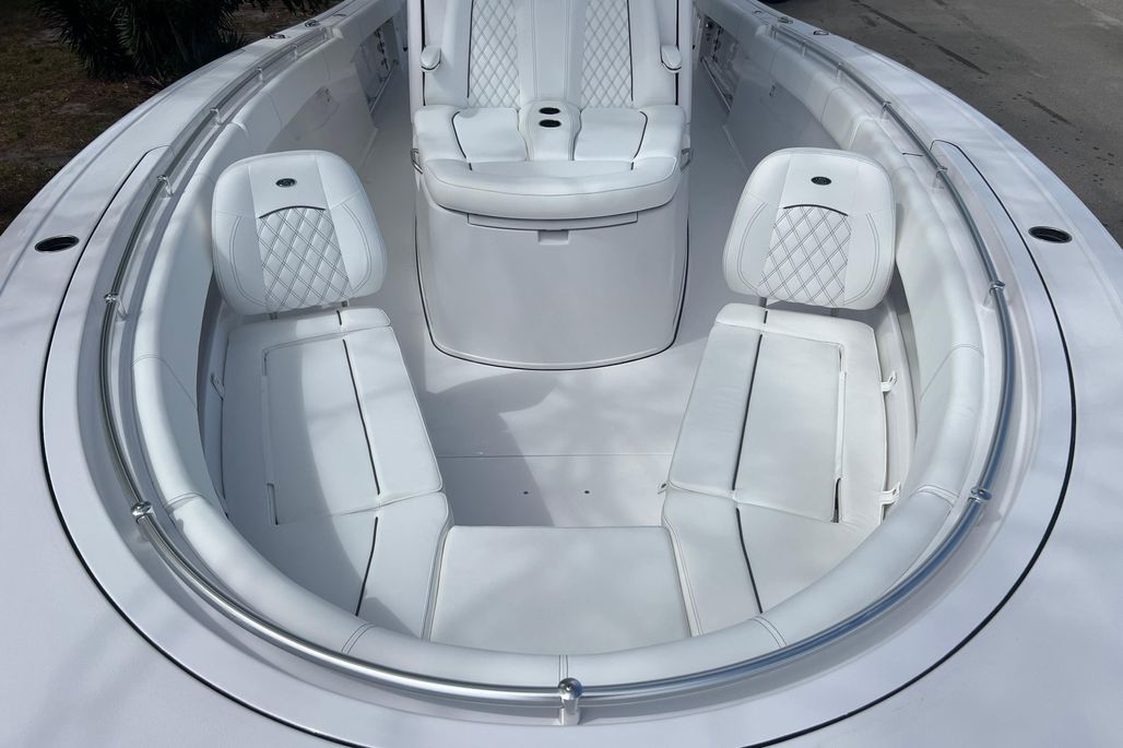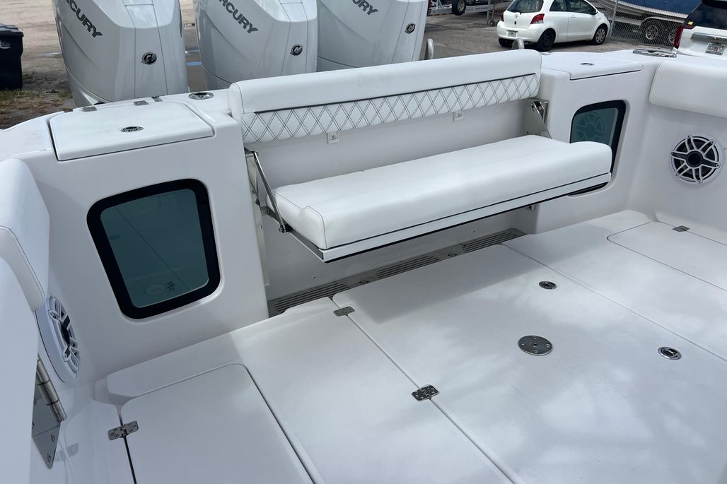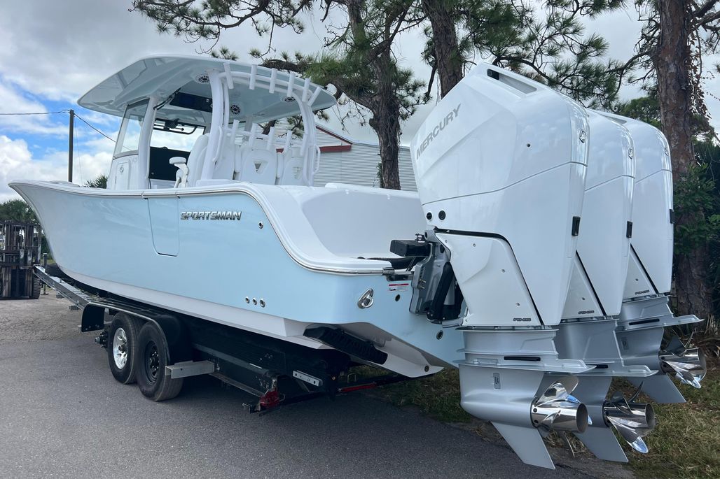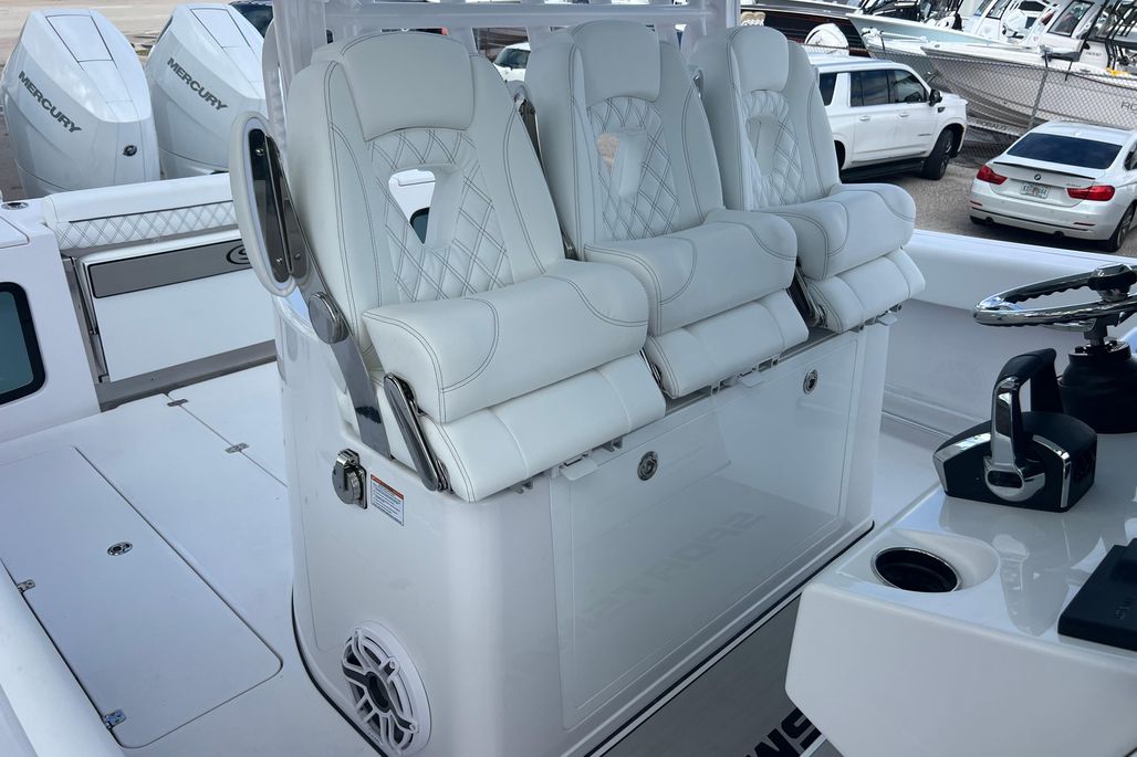 This Sportsman 352 Open is in stock right now and powered with the new Triple Mercury 400 HP V10 4-Strokes w/ Joystick Piloting!! This boat performs incredibly well with these engines. Sportsman did an awesome job in the design of this boat. There is so much to offer including the Air Conditioned cabin in the console, Mercury Joystick Steering w/ Sea Station, two Garmin 22" Multi Function Displays, Open Array Radar, & a wide array of seating & Lounging space. The boat also features two side Dive Doors, two 30 gallon Live wells, & (2) Electric Reel Outlets. The Cabin is Airconditioned and powered by a 12 volt battery operated system and there are also vents on the dash for the drivers. The stereo is all JL Audio and has (10) Speakers, (2) Subs, and (3) Amps. The access into the bilge compartment is gigantic, all the equipment in the bilge is extremely easy to get to and there is a lot of storage in there. The seating is amazing and offers Club style fold down benches in the rear cockpit. There is also very comfortable seating in the bow with an Electric Table / Filler Lounge allowing you to sit up there and have lunch with the table up or lower it down to use as a big sun lounge or lower it all the way down to make it completely open.
