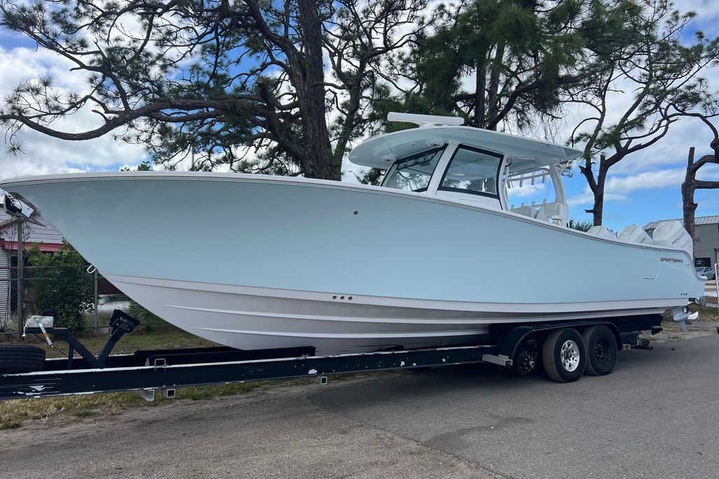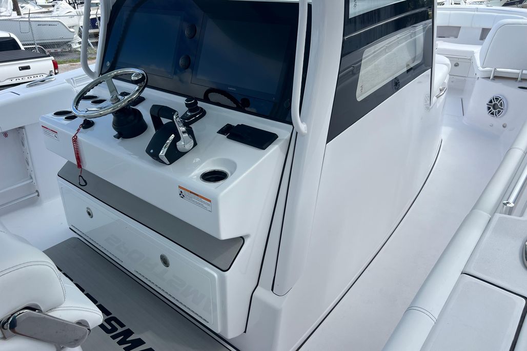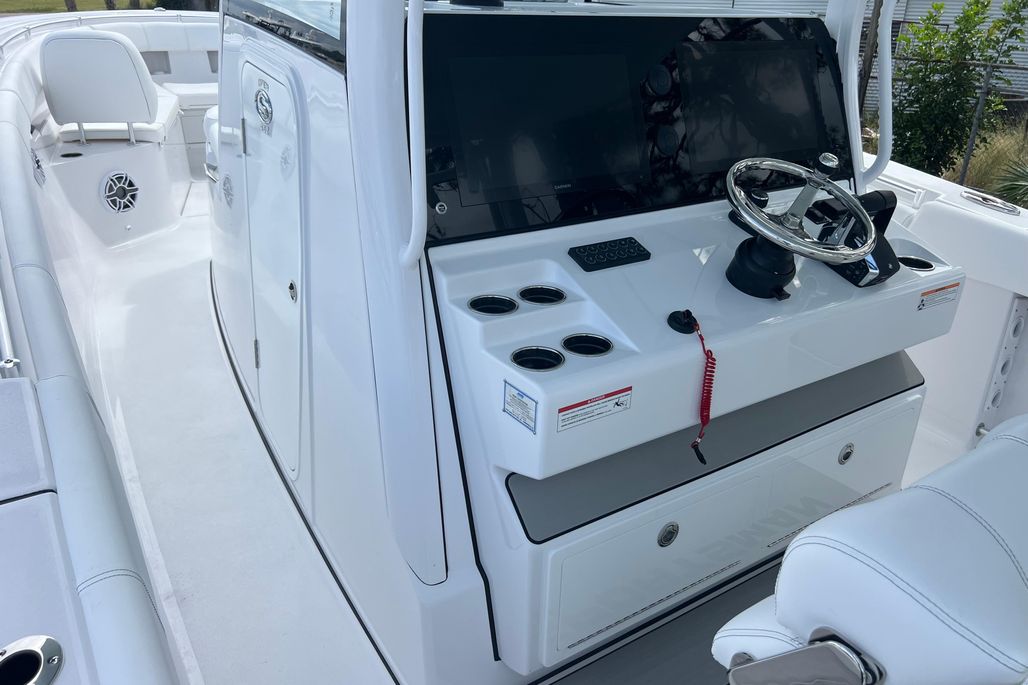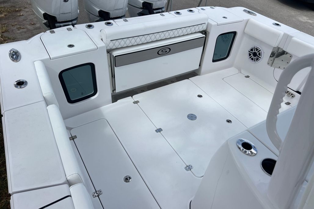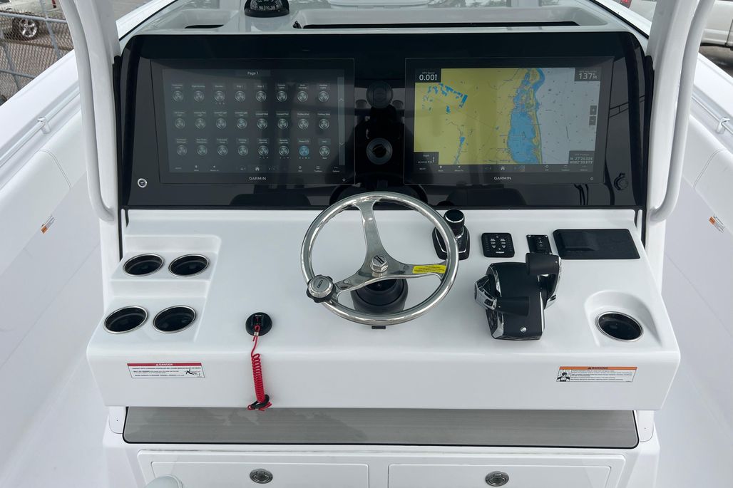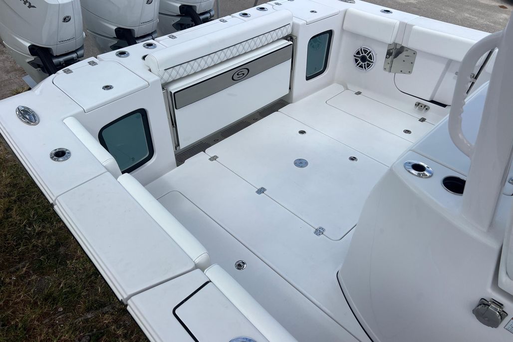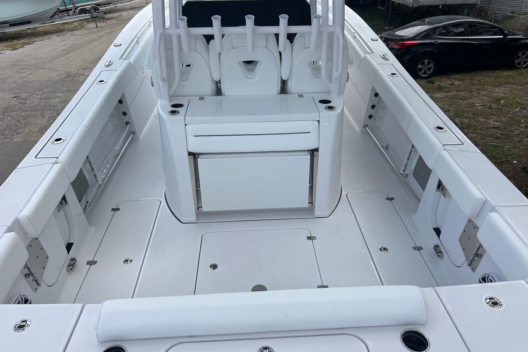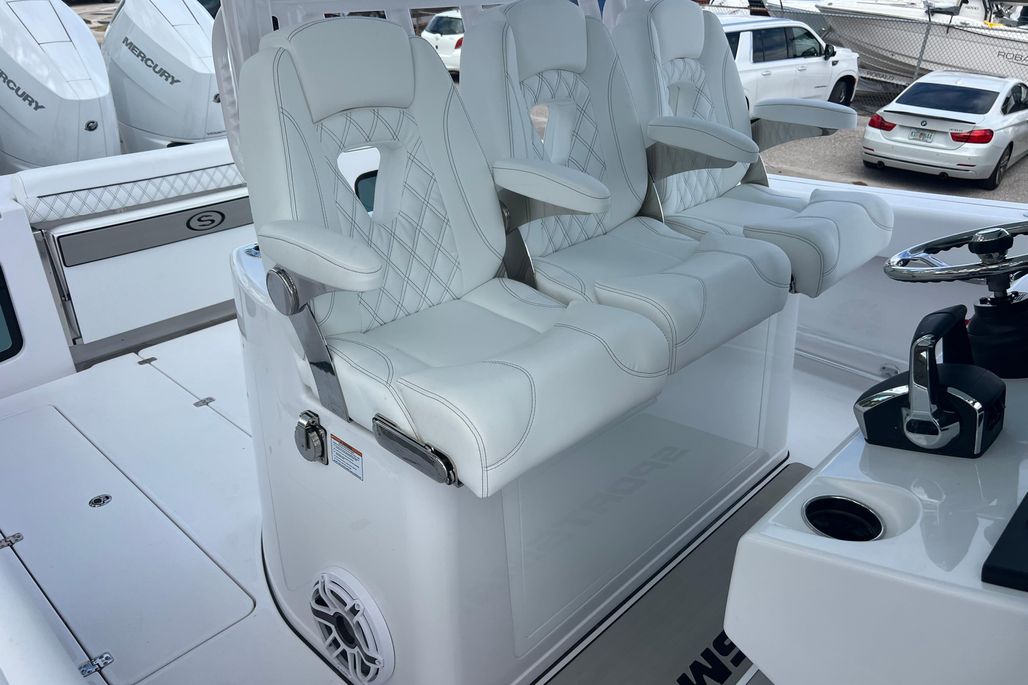 This Sportsman 352 Open is in stock right now and powered with the new Triple Mercury 400 HP V10 4-Strokes w/ Joystick Piloting!! This boat performs incredibly well with these engines. Sportsman did an awesome job in the design of this boat. There is so much to offer including the Air Conditioned cabin in the console, Mercury Joystick Steering w/ Sea Station, two Garmin 22" Multi Function Displays, Open Array Radar, & a wide array of seating & Lounging space. The boat also features two side Dive Doors, two 30 gallon Live wells, & (2) Electric Reel Outlets. The Cabin is Airconditioned and powered by a 12 volt battery operated system and there are also vents on the dash for the drivers. The stereo is all JL Audio and has (10) Speakers, (2) Subs, and (3) Amps. The access into the bilge compartment is gigantic, all the equipment in the bilge is extremely easy to get to and there is a lot of storage in there. The seating is amazing and offers Club style fold down benches in the rear cockpit. There is also very comfortable seating in the bow with an Electric Table / Filler Lounge allowing you to sit up there and have lunch with the table up or lower it down to use as a big sun lounge or lower it all the way down to make it completely open.
